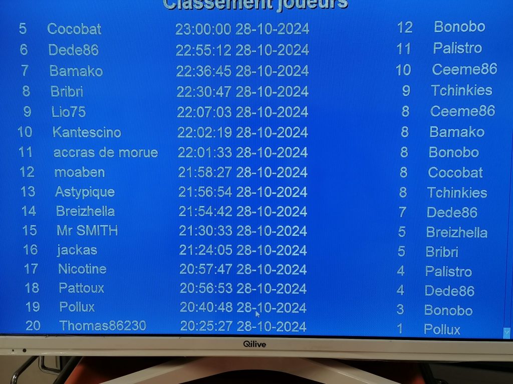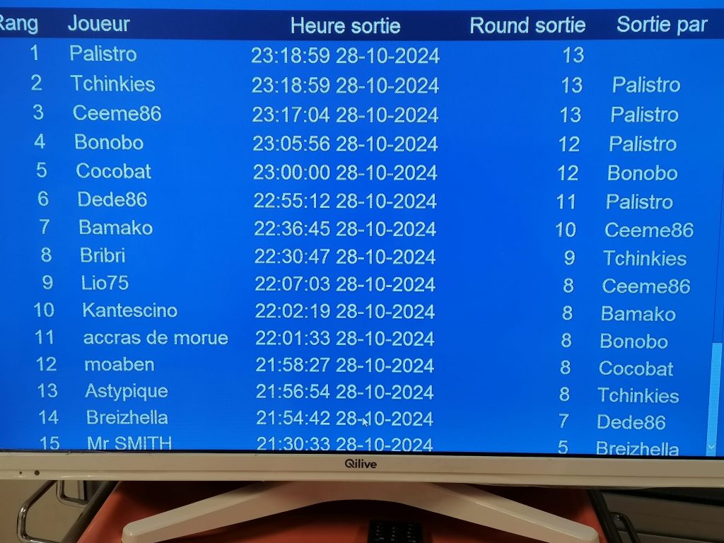 Il était presque 22h quand MOABEN abandonna ses derniers jetons à son Président pour aller retrouver une femme délaissée le temps d’une soirée ; ils n’auraient que quelques minutes avant le retour de BAMAKO mais c’est toujours ça de pris. Depuis qu’il connaît l’adresse on ne le voit plus sur la photo finish, c’est bizarre ! Mal embarqué avec tout juste 5K restants, LIO survécut encore quelques minutes et tenta de faire le spectacle en montrant un carré d’As vs ASTYPIQUE, mais CEEME le stoppa aux portes de la TF, qui du coup commença tout juste après 22h, un record !