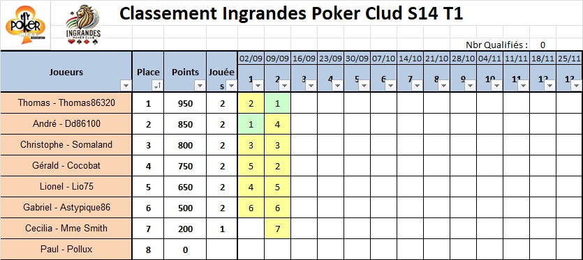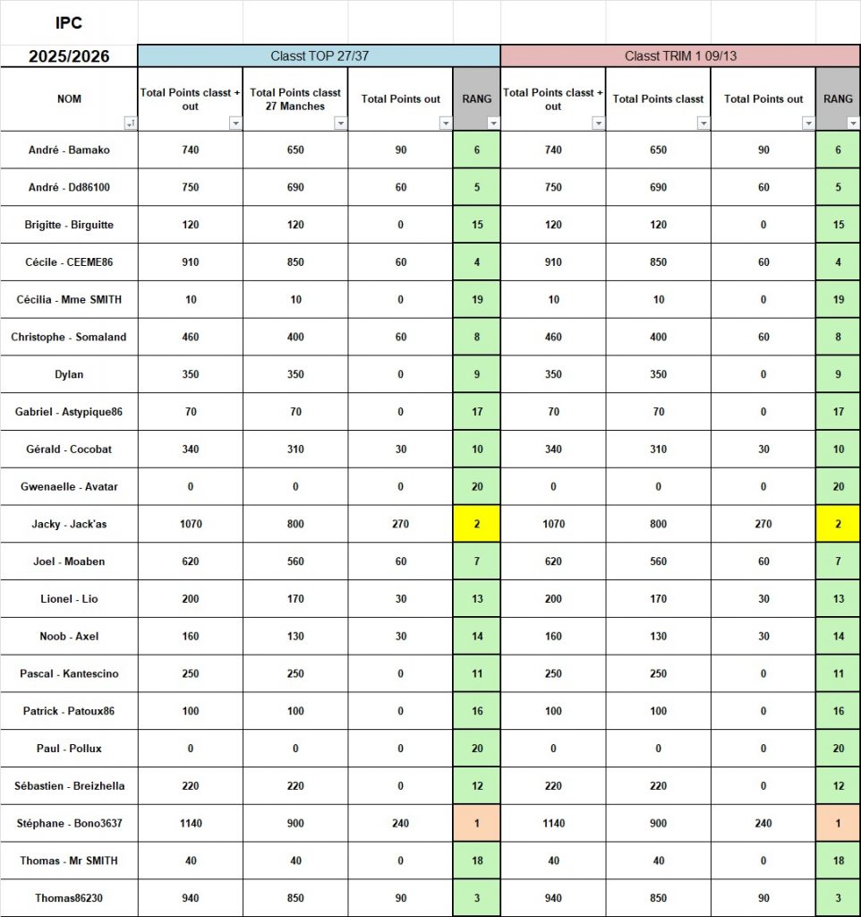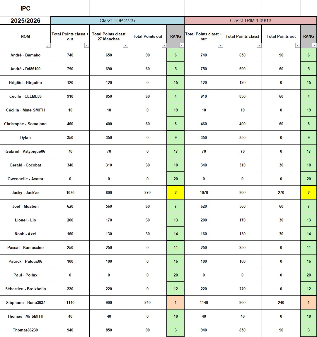 Et voici tous ceux et celles qui vont vouloir le faire chuter : Dédé86100, notre dernier vainqueur de l’open IPC et nouveau trésorier (attention car c’est généralement la banque qui gagne), Lio, le dauphin du champion et notre conteur adoré (Il adore vous raconter des histoires à table !), Pollux, notre vice-président, aussi à l’aise à 10000 pieds qu’avec les différentes mains que vous le laisserez jouer, Moaben qui en impose à table, Bono3637, notre globetrotter attitré, Palistro, notre représentant multi cartes, Brigitte, notre novice qui commence à apprécier le vice du jeu, Patttoux, l’un des piliers du temple, Cocobat, un président qui n’a pas besoin de vote de confiance, Thomas86320 qui veut faire partie des prétendants, somatland86 qui n’est plus en période d’adaptation, Bamako qui aime le poker, la bonne cuisine et surtout sa femme, Breizhella qui veut retrouver son jeu précédant sa longue absence, Mr & Mrs Smith qui vont nous jouer leurs dernières scènes, Ceeme86 qui compense avec la folie philosophique ou la philosophie folle de son Kantescino, Astypique qui va devenir croupier professionnel pour élargir son jeu déjà illimité, Dylan, la relève qui pousse très fort, Avatar, une exilée qui aime se ressourcer dans notre monde, ainsi que noob,notre néophyte de cette nouvelle saison (Attention Daddy !).