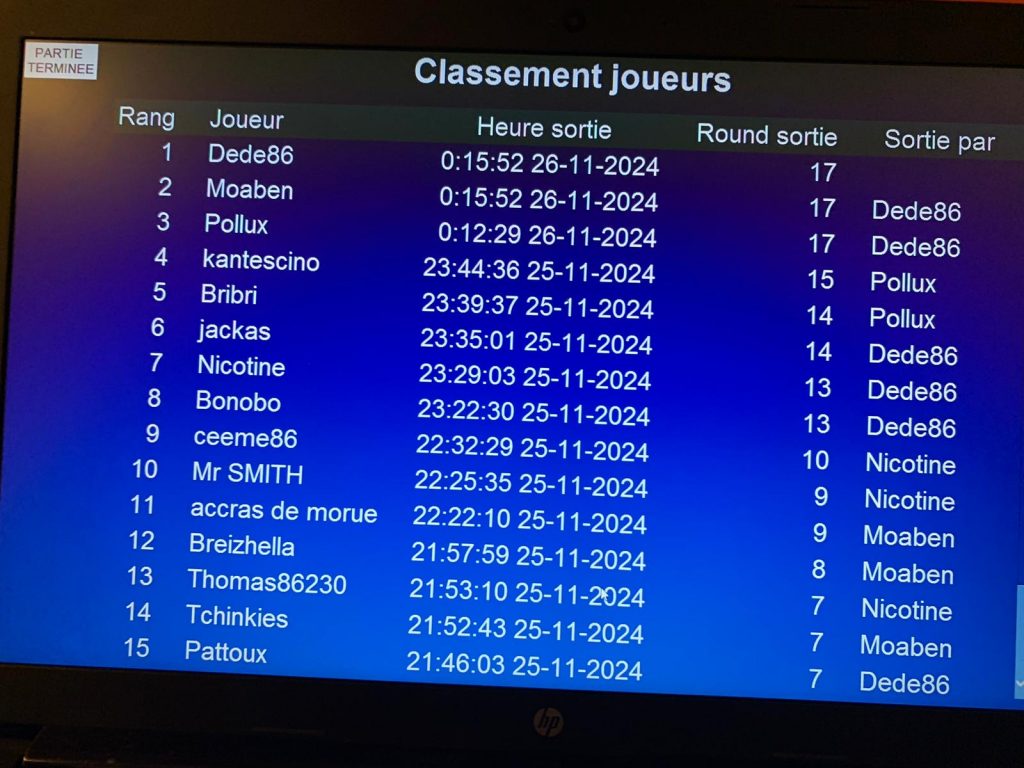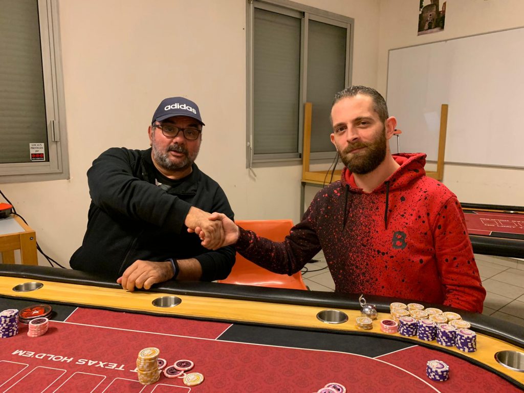 Autre fait remarquable de la soirée, qui s’est inscrit dans la durée plus que sur un coup d’éclat, le réveil du champion. 3 outs et plus qu’une table finale, une deuxième place pour MOABEN, ET OUAIS!! Et tout ça en jouant avec une main dans le dos un coup sur deux à cause d’un dealer vraiment nul qui ne lui donne jamais de jeu (mais qui a fait ce qu’il faut dans le monney time pour le faire double de 40 à 80K).