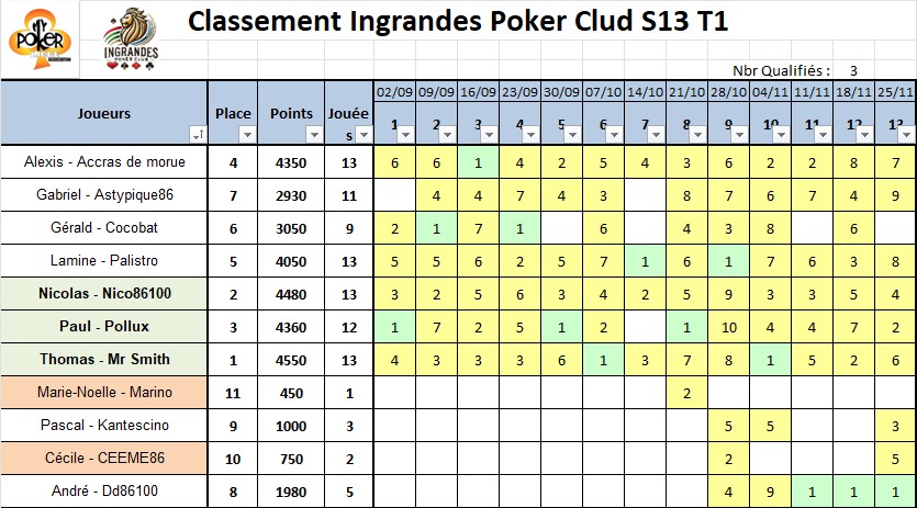 Bravo à DD pour cette éclatante victoire bonifiée de 8 outs, bravo à MOABEN qui a su passer entre les gouttes et les breaks pour se hisser à la deuxième place, et bravo à POLLUX, qui est allée checher sa place sur le podium en sortant lui-même les 4è et 5è (KANTESCINO et BRIGITTE).