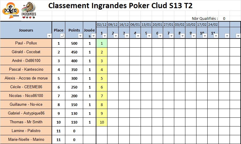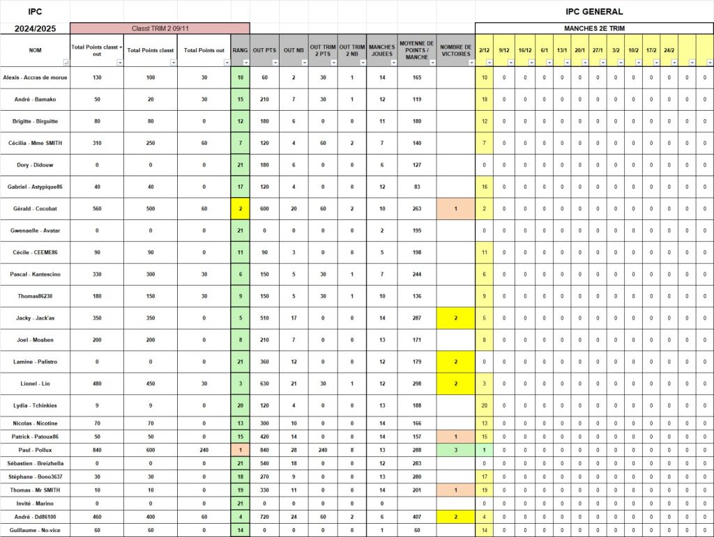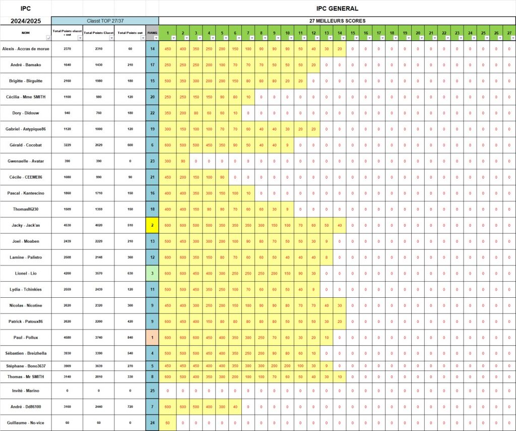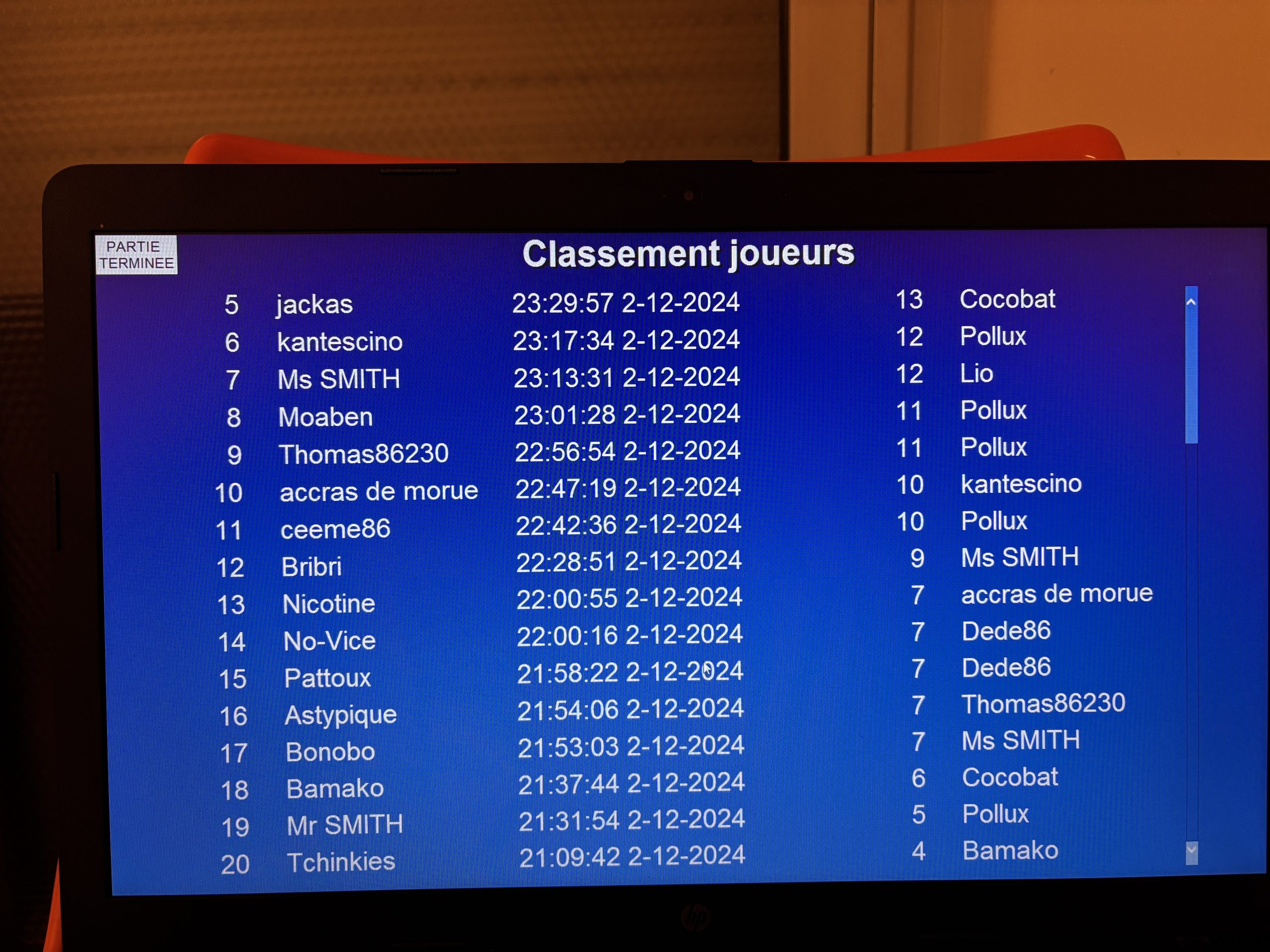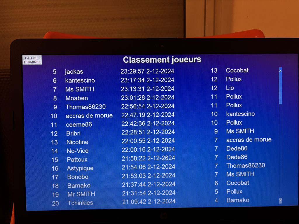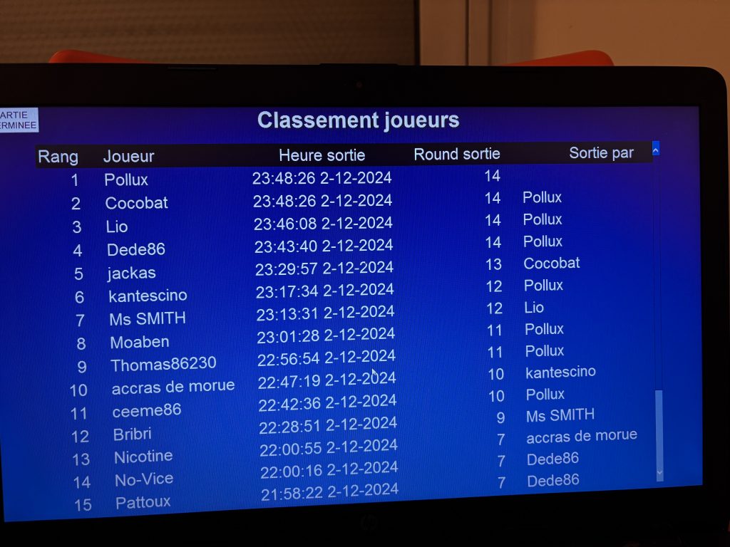 Le plan fonctionnait parfaitement. DD avait consenti à ne pas être sur la photo fifish pour cette fois, à condition qu’on lui laisse une place de choix (4è c’est bien, il a des parties de retard à ratrapper notre DD). 3è et déjà très content, LIO s’effaça pour permettre à COCO d’offrir cette victoire sur un plateau d’argent en guise de cadeau d’anniversaire collectif. Mais non je ne l’ai pas dit, POLLUX a très bien joué et il mérite amplement cette victoire OK, la 3è. Et comme un bonheur n’arrive jamais seul, il cheape la première place du top 27 à JACKY d’une courte tête (alors qu’il compte une partie de moins) et prend évidemment les commandes du trimestre. Encore une belle soirée et partie à Ingrandes, vivement la prochaine.