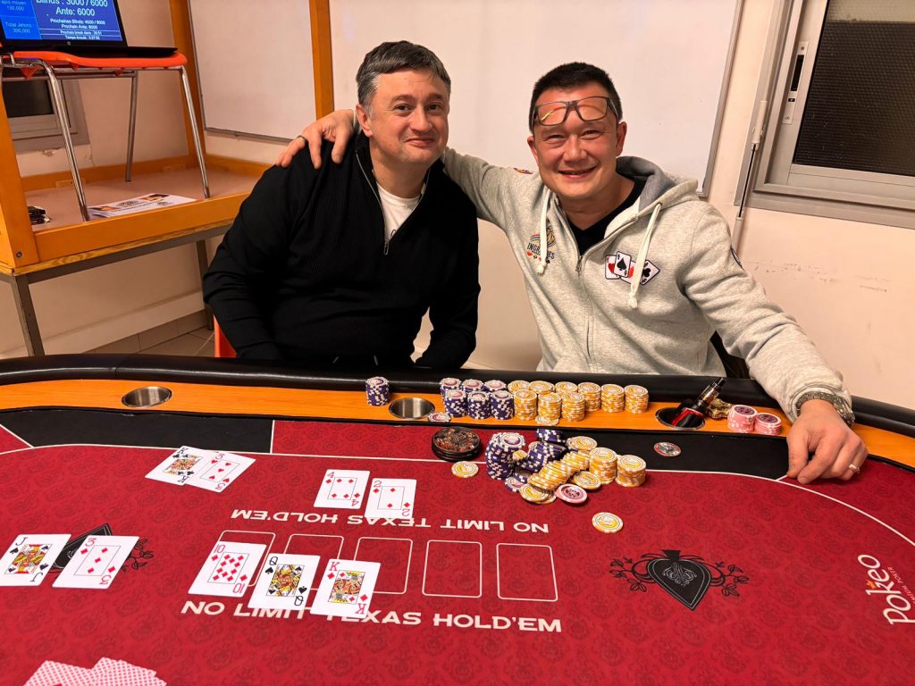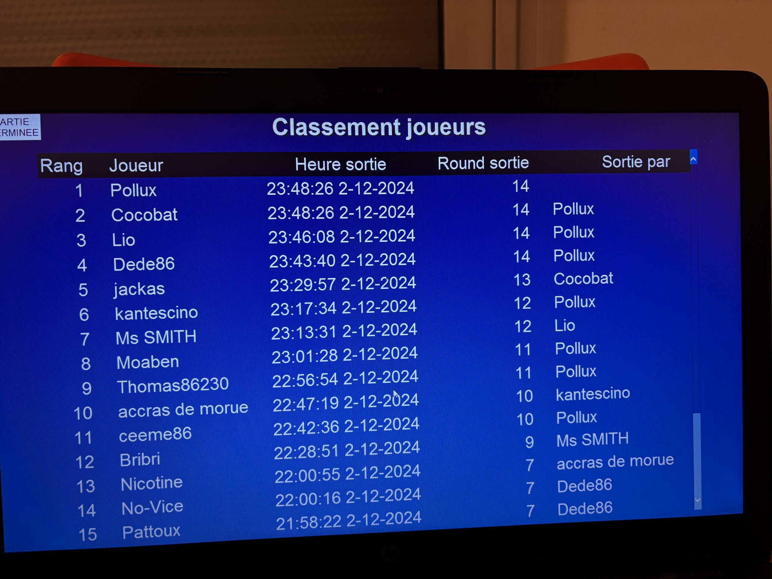 Tout un contexte marquait cette soirée du 2 décembre, au cours de laquelle les 20 joueurs présents espéraient chacun être l’Elu. Comme à KHO LANTA à la fin il n’en restera qu’un (ou une), et désolé pour ceux que je couperai au montage, j’espère qu’ils seront à l’honneur la prochaine fois (tant que ce n’est pas “la noix d’honneur” du canard enchaîné, ça va). Moi-même n’ayant pas été censuré (contrairement au grand Barnier) je peux continuer mon mandat de conteur officiel. 20 joueurs donc, dont un NO-VICE qui nous fait le plaisir de son retour (un ancien champion du club et un client de plus à se farcir, merci) pour cette première manche du 2è trimetre, où les uns auront à coeur de se refaire (MOABEN, PATTOUX, ASTYPIQUE, NICO…) pendant que ceux qui sont devant voudront confirmer, et où chacun rêvera de briller. POLLUX nous avait amené de quoi régaler nos papilles pour fêter son anniversaire (merci à lui), PATTOUX le catalogue de notre collection 2024-2025 (pensez à vos commandes pour lundi svp), et TOMY les boutons dealer à l’effigie du club faits par ses soins. Ils sont superbes, ils claquent, du vrai travail d’orfèvre, merci et bravo à lui (en plus du boulot qu’il fait autour de la création de notre site).