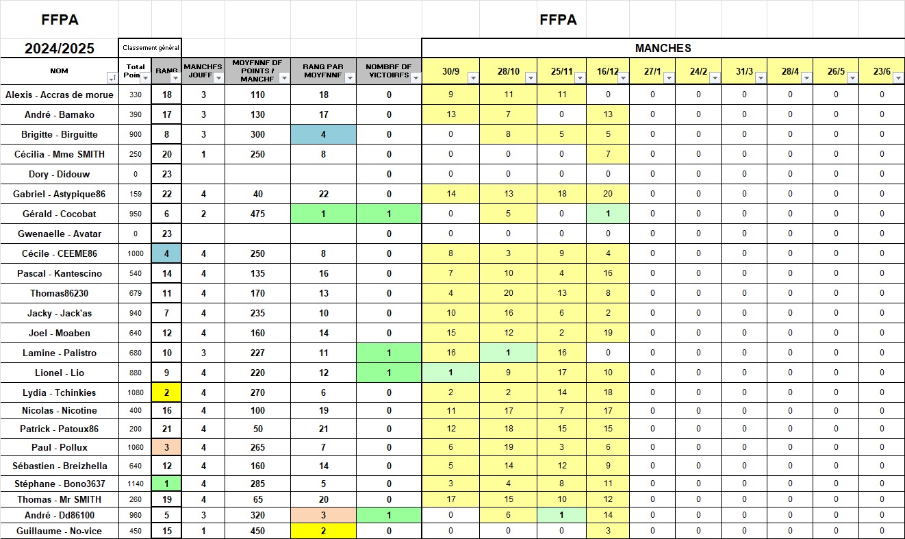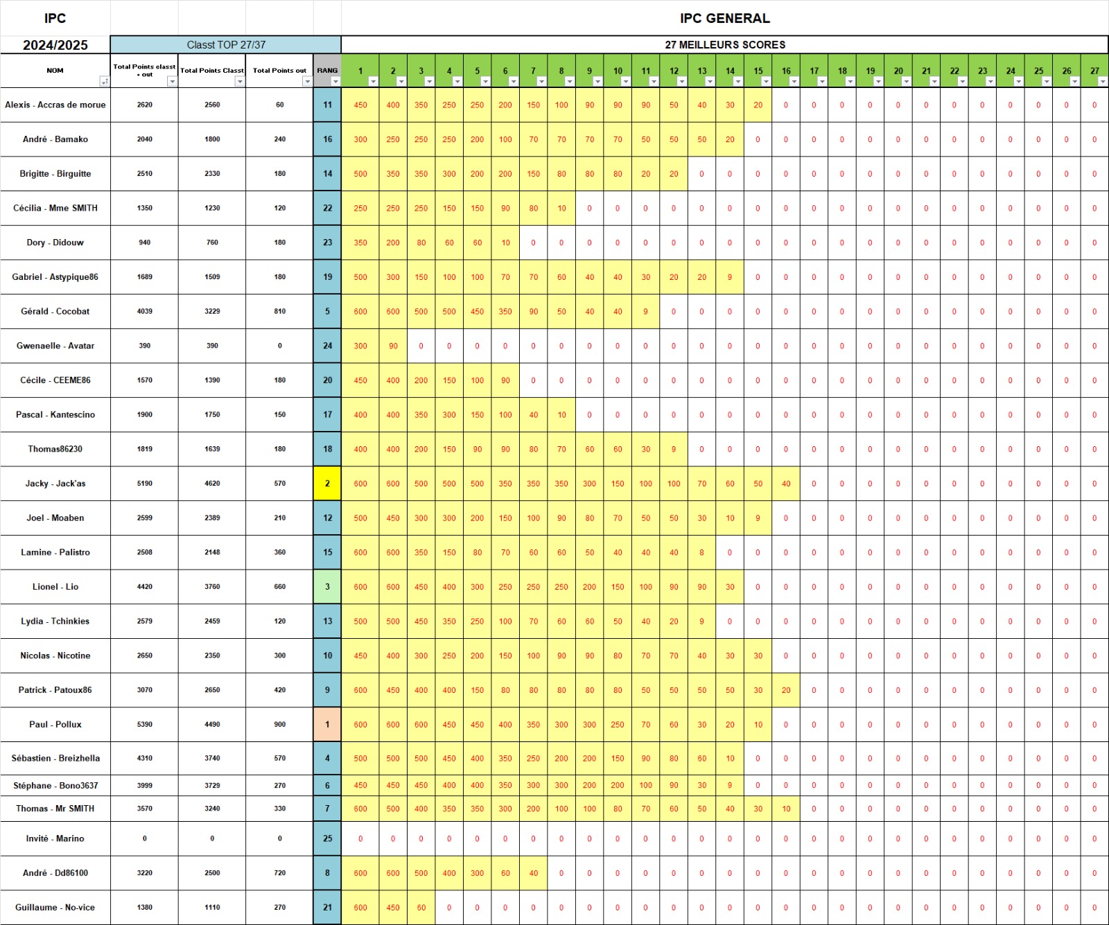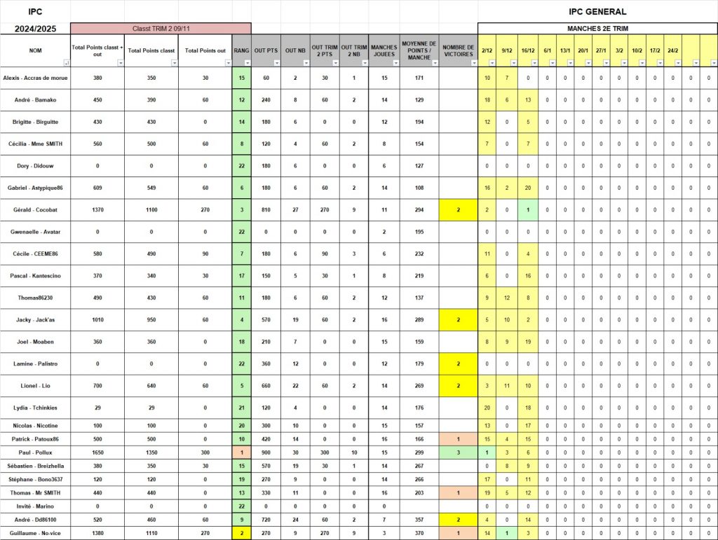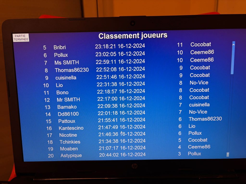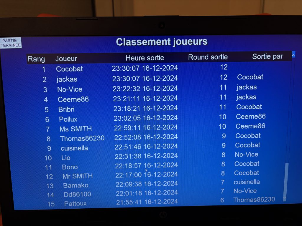 Dernière partie de l’année avant la trêve des fêtes de fin d’année, et comme il est d’usage à IPC, on se fait des cadeaux et on peut venir vêtu de son pull moche de Noel ou d’un couvre-chef de Père Noel. Certains étaient bien dans le thème de Noel, d’autres pas trop, les photos prises à cette occasion rendent bien la joie et la bonne humeur ambiante, du moins avant que la partie commence, car une fois le chrono déclenché, les cadeaux ne sont plus de mise, mais les relances, si. Retour à la normale avec 20 joueurs (et joueuses, c’est bon arrêtez de faire ch…avec l’écriture inclusive) et quatre tables de sorties, dont une qui devra faire un arrêt au stand pour une réparation.