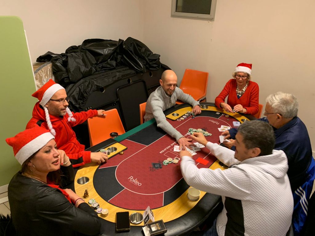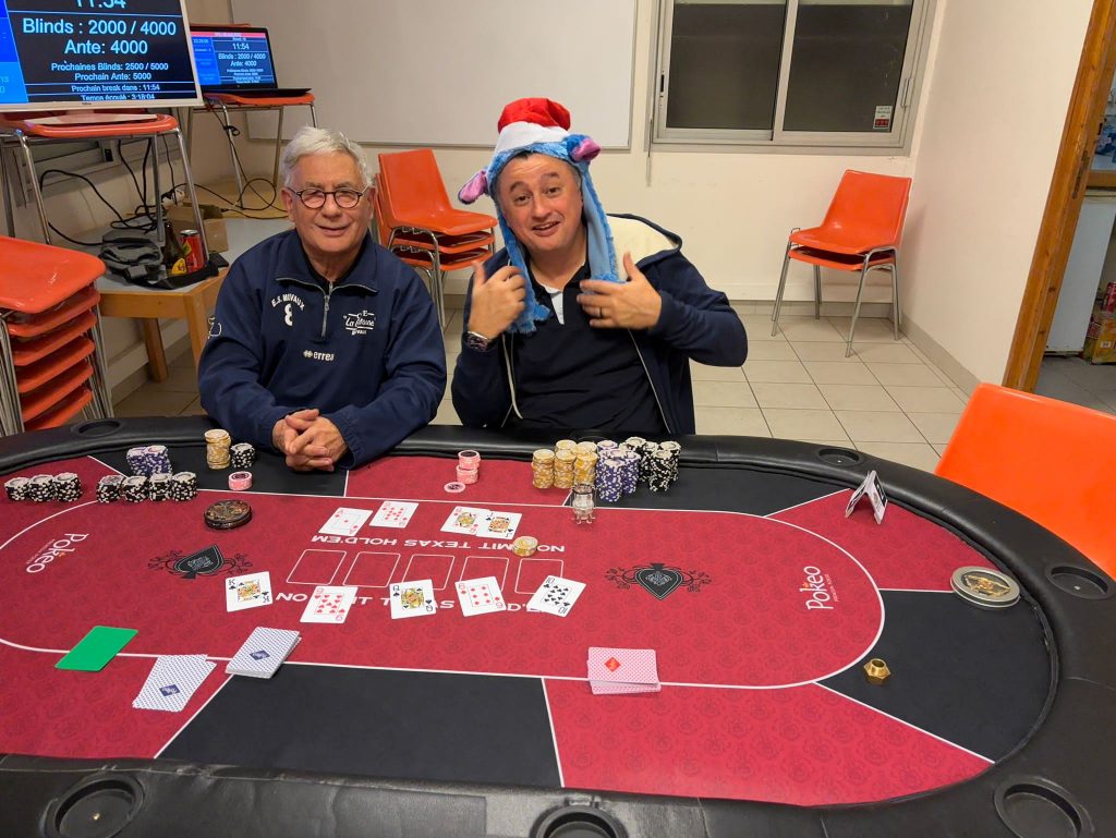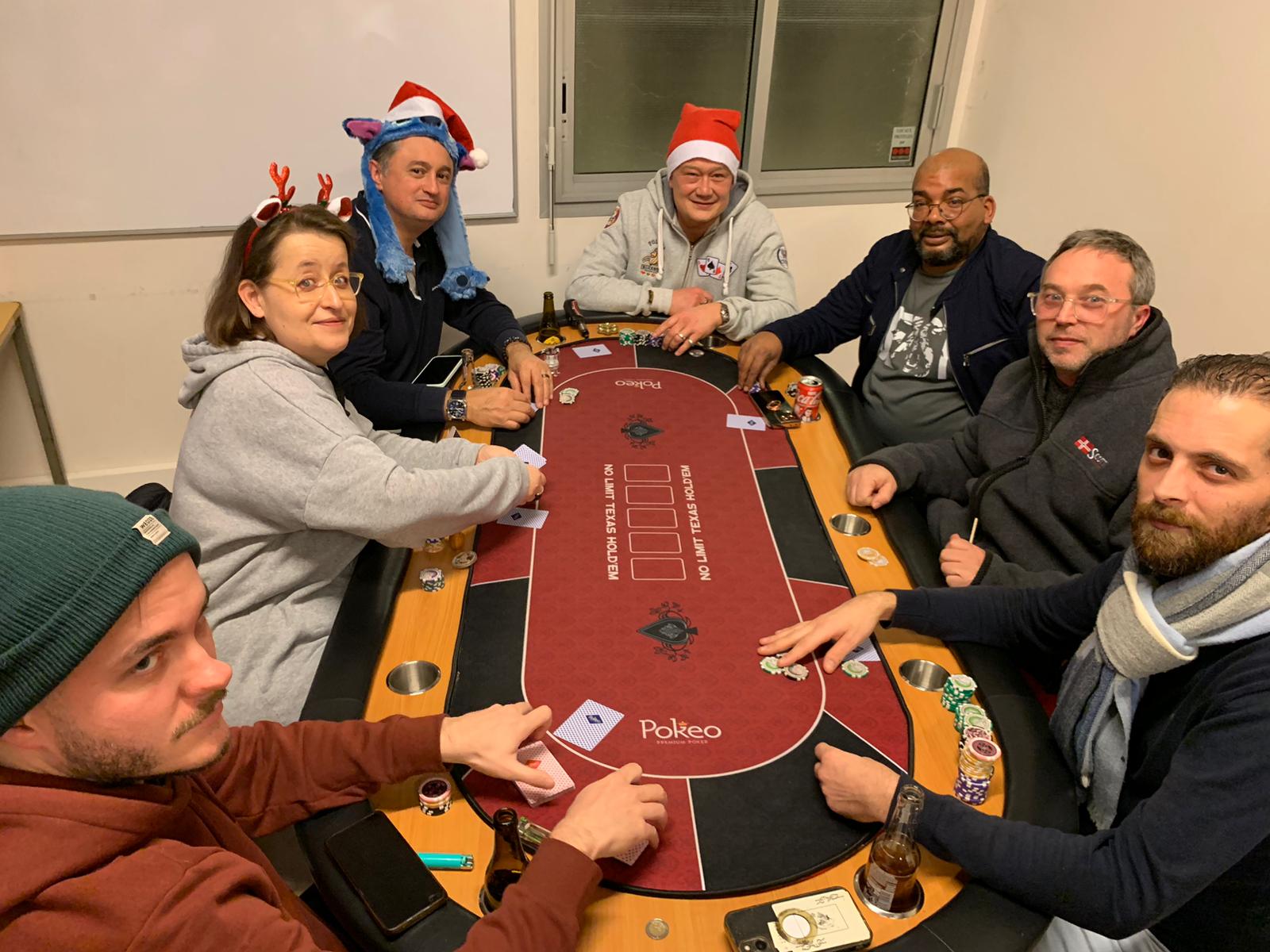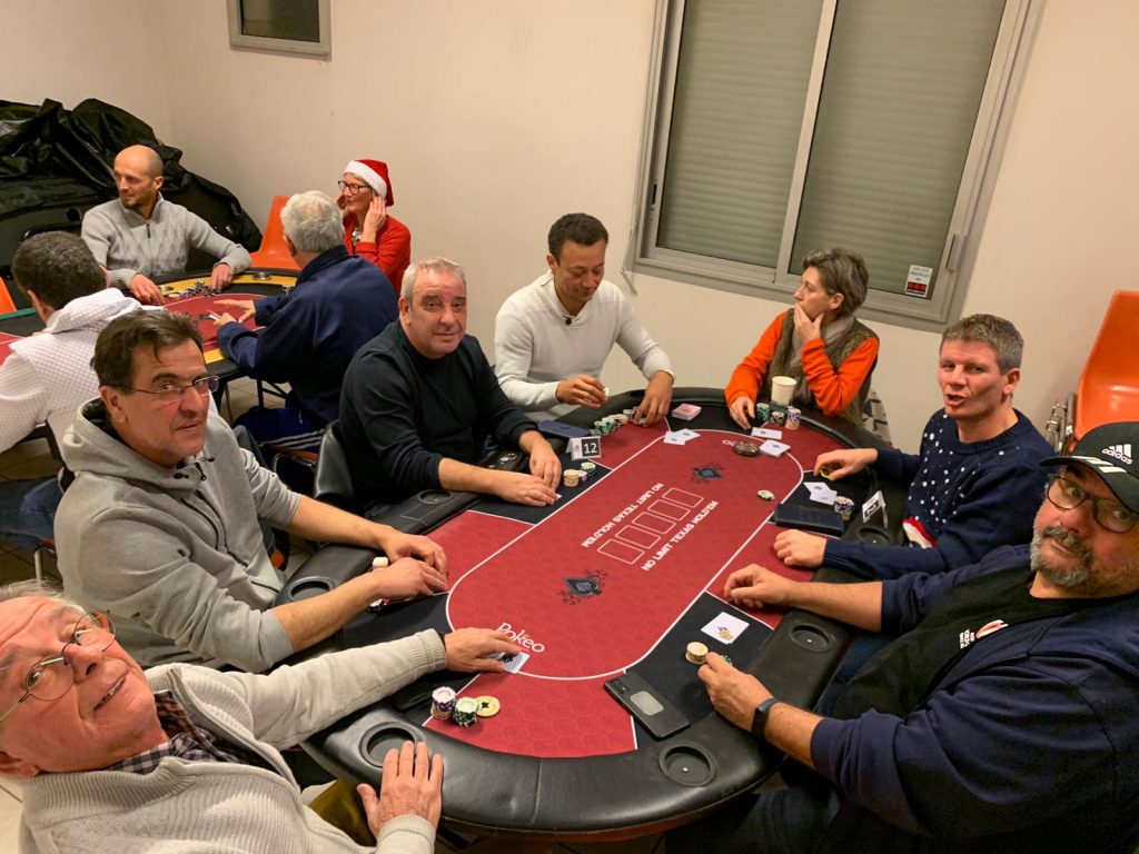 Nous étions passés à deux tables. En table 1 MR SMITH, qui n’est pas du genre à prendre des vessies pour des lanternes, décida d’y aller franco avec les JJ en mains, ce qui fit frétiller les oreilles de COCO. Ce dernier toucha son As river (le fameux) et flingua les JJ. Il n’eut pas le temps de ranger sa chambre qu’il retourna au charbon et dut en plus ranger les jetons de BONO, qui se consola avec un superbe pull de Noel (et des boules qu’on peut jeter dessus…) qui vient sans doute du même atelier que celui porté par BREIZHEILLA…