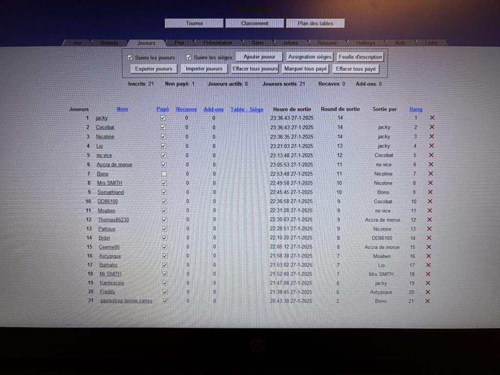 La partie démarra avec en table 1 BONO,MOABEN, NICO, NO-VICE, PALISTRO, PATTOUX, SOMATLAND (autrement dit que des joueurs sérieux plus PALISTRO), en table 2 les artistes ACCRAS, CEEME COCO, DD LA SAUMURE, JACKY, KANTESCINO, THOMAS, et en table 3 et les mangeurs de graines BRIDGET, LIO, MR ET MME SMITH, plus ASTYPIQUE, BAMAKO et FREDDY.