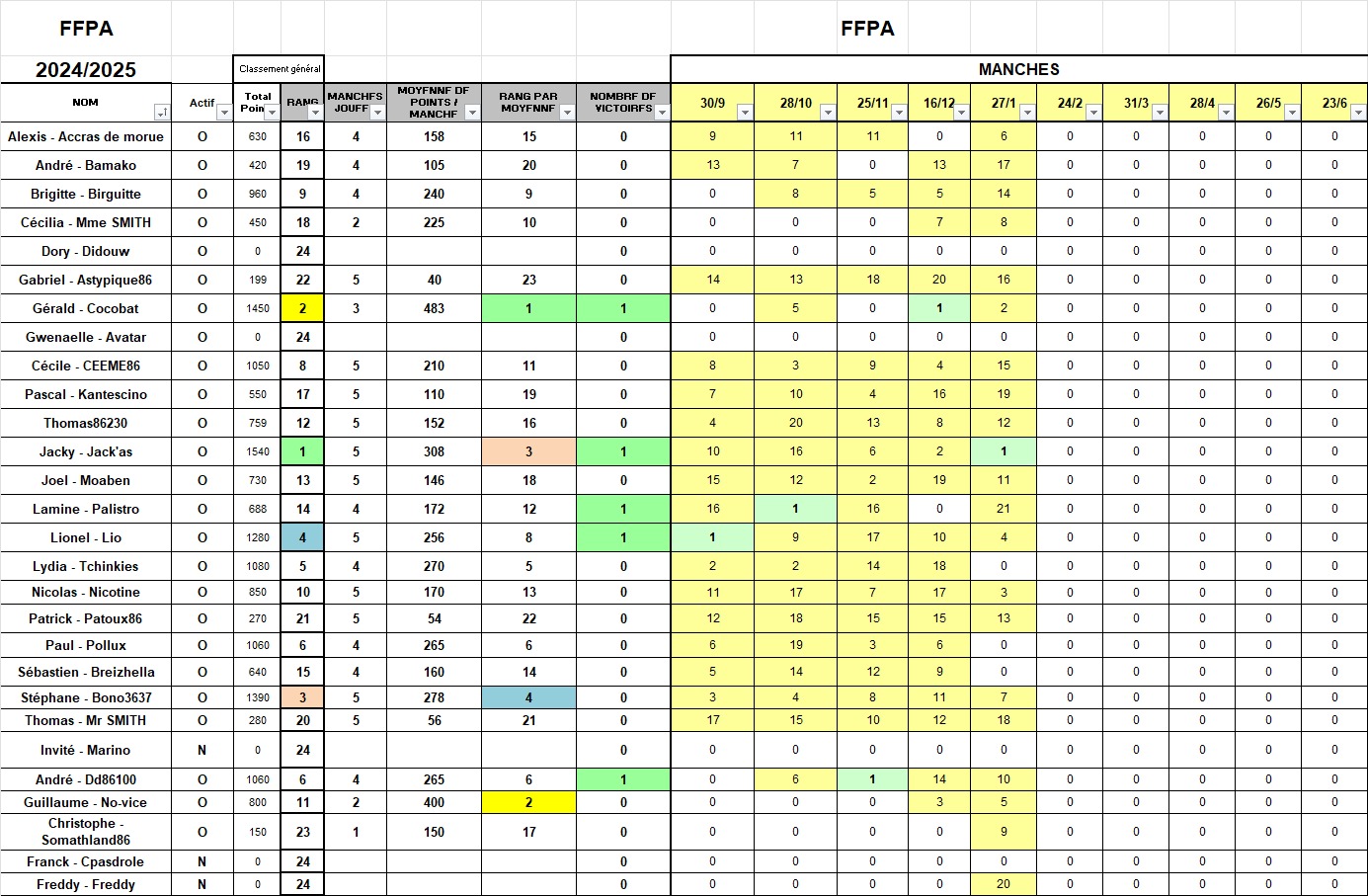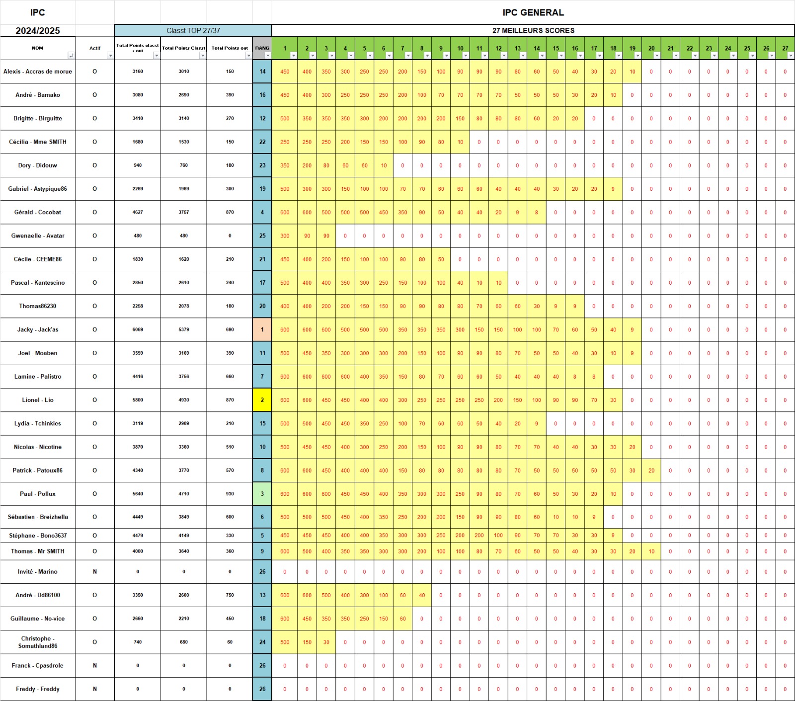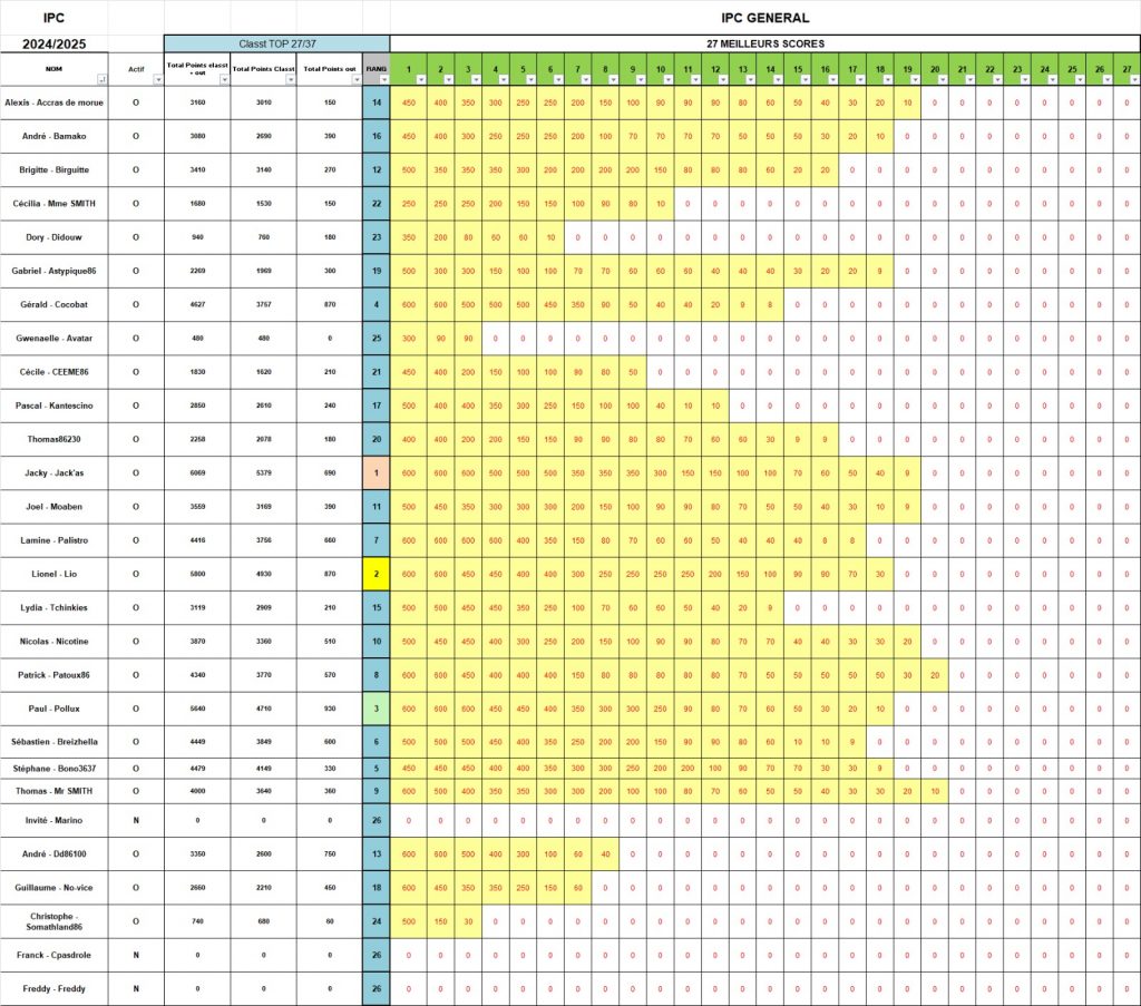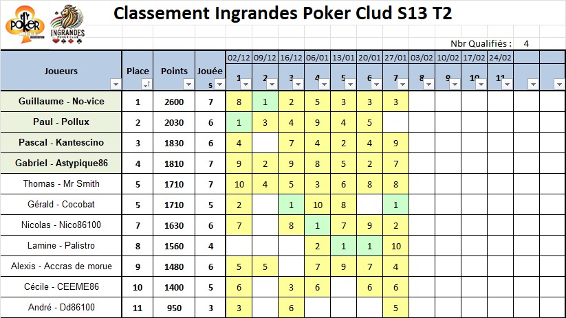 NICO serait le prochain sur la liste de JACKY, lequel ne fera pas non plus de détail dans l’histoire de ce HU avec COCO : une couleur chattée river en partant avec K4 de carreau, voilà comment conclure en beauté une partie et signer sa troisième victoire de la saison. Bravo à JACKY, qui « profite » de l’absence de POLLUX ce soir pour prendre la tête du Général à mi-championnat et passer seul la barre des 6000 points. Suivent LIO à 5800, POLLUX à 5600, et un groupe chasse entte 4600 et 4300 dans lequel on retouve COCOBAT, BONOBO, PALISTRO, BREIZHSTORM, et PATTOUX. Pour les autres, rien n’est perdu mais il va falloir scorer et ne plus trop se trouer s’ils veulent jouer devant.