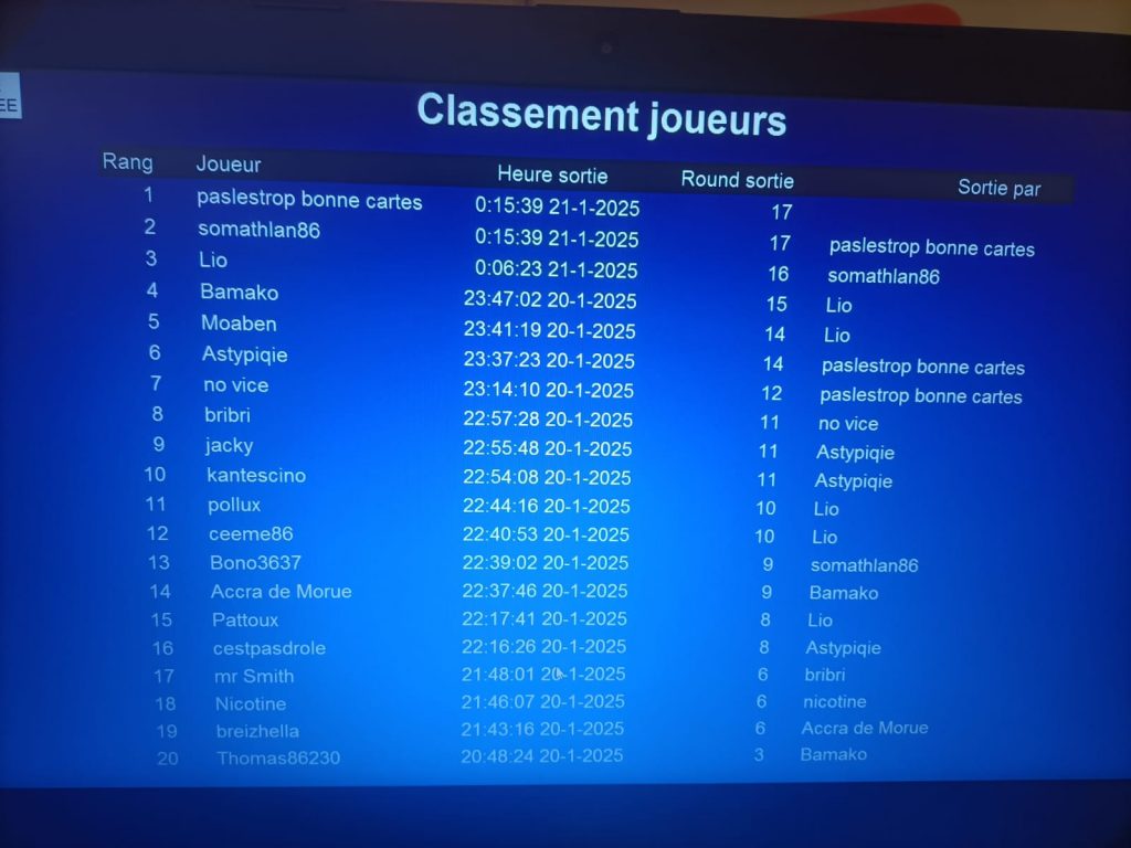 Nous avions notre TF, et pile dans les temps! (THOMAS, lui aussi réglé comme une horloge, tirait sa révérence pile à 22h, sorti par JACKY). Une TF avec BRIDGET CEEME MOABEN qui n’avaient pas bougé depuis le début, accompagné par ACCRAS qui arriva avec une bourse et des poches pleines de jetons (ça dégoulinait de partout, on se demandait quand ça allait s’arrêter, c’était indécent), JACKY, LIO, MOABEN, NO-VICE (qui avait bien fondu et investi dans les actions de la morue), et PATTOUX. Avec maître KANTE en dealer, qui était tellement attentif à ce qui se passait dans le jeu qu’il partit plusieurs fois à la fausse donne, ce qui lui valut quelques taquineries.
