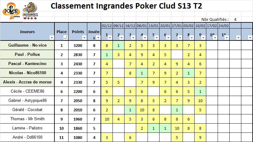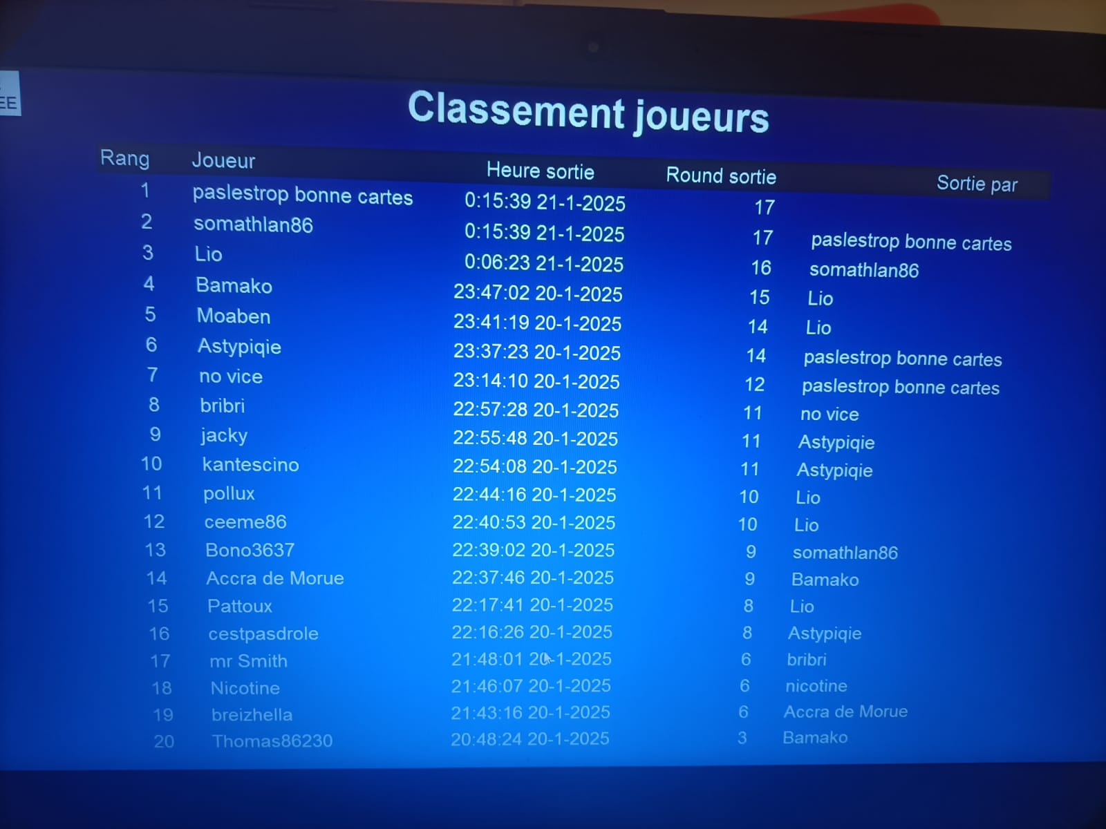 Plus que cinq joueurs, deux femmes et trois hommes, un de trop en cette semaine de St VALENTIN où on devrait célébrer l’amour et les amoureux. CEEME sacrifia JACKY, et deux couples (je ne vous dis pas lesquels) allaient se disputer la timbale. BRIDGET, toujours hésitante avec ses doigts et se ses jetons (j’y vais, j’y vais pas?) et folle de lui (voir photo à venir) vacilla la première pour finir à une plus qu’honorable 4è place.
