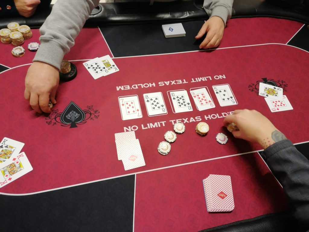 ACCRAS, CEEME et PATTOUX poussaient leur tapis à tour de rôle, mais n’entendirent pas d’écho, jusqu’à ce coup d’antologie où les trois se retrouvèrent à tapis : ACCRAS (KK) vs CEEME (K9 de pique) et PATTOUX (Q10).