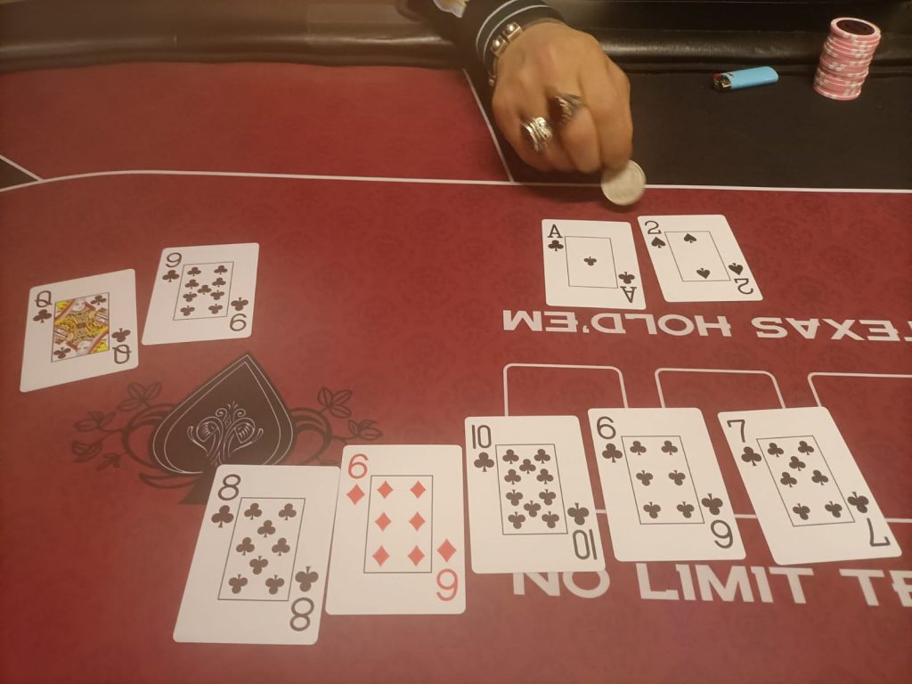 Une TF dealée et arbitrée par notre NICK OEIL DE LYNX, qui voit tout, et en plus fait les comptes plus vite que son ombre. Comme sur cette confrontation entre SOMATLAND et PALISTRO, qui touchèrent tous les deux leur couleur river. Sauf que le 6 de trèfle donnait la quinte flush à SOMATLAND, qui domina ainsi la couleur max du MAESTRO. P…D.B.D.M, lâcha-t-il dans un soupir désespéré. Heureusement que ce dernier s’était constitué un stack conséquent, notamment en sortant ASTYPIQUE, monsieur je rentre dans 70% des coups, même s’il faut limper Q4 off UTG (je l’ai vu!!). A ‘ment donné, il fallait que ça s’arrête.