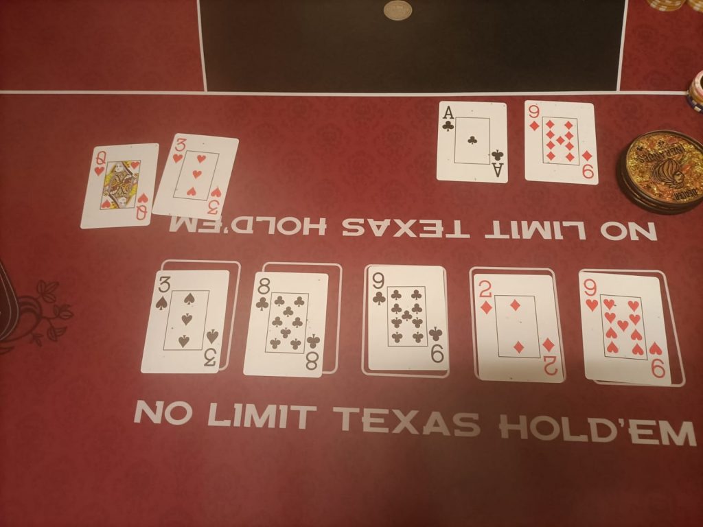 KANTESCINO et NICO se mirent à deux pour sortir PATTOUX, avec la même main, les 99, ce qui sur le coup ne les arrangeait pas du tout, et c’est KANTE qui hérita de l’out au goal average. Nico se consola bien vite en prenant celui de CEEME, ce qui ébranla KANTESCINO : ce dernier, après une ultime pirouette et un théorème sur quoi faire ne fonction de l’état des sous-vêtements adverses (fallait être présents pour comprendre les gars), quitta la scène avec le panache qui le caractérise. C’est le moment de parler de SOMATLAND, son bourreau du soir, un joueur aussi discret et efficace qu’un sniper des forces spéciales : on ne le voit pas, on ne l’entend pas, avec ça il est d’une précison chirurgicale, et quand il pointe ses jetons sur vous, c’est déjà trop tard, vous êtes mort. Aprsè KANTESCINO, SOMATLAND prit ACCRAS et POLLUX dans ses filets sur un strike des familles, et aborda le HU devant, 175k vs 125k pour NICO.