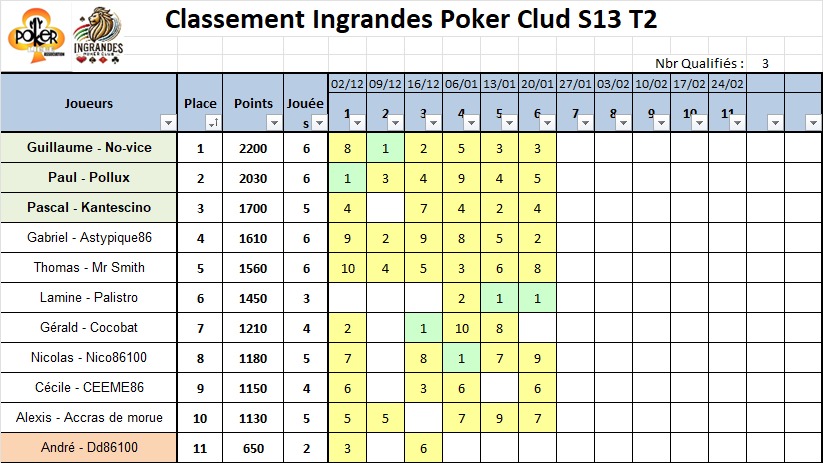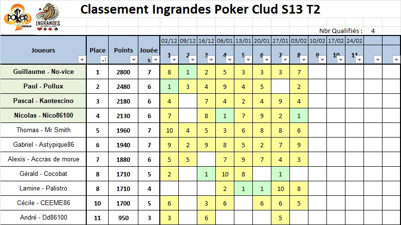A ce stade, la tendresse et la poésie n’avaient plus lieu d’être, ça cherchait le KO des deux côtés, à coups de tapis pré-flop. A ce petit jeu, NICO grapilla, grapilla encore, jusqu’à repasser devant en cheaps, pour finalement l’emporter sur le seul tapis pré-flop payé du HU. Bravo à NICO pour cette victoire, qui lui permet de se replacer au classement trimestriel, bravo messieurs pour ce podium et ces places d’honneur, et mention spéciale à POLLUX qui avec cette troisième place reprend les commandes du Général.