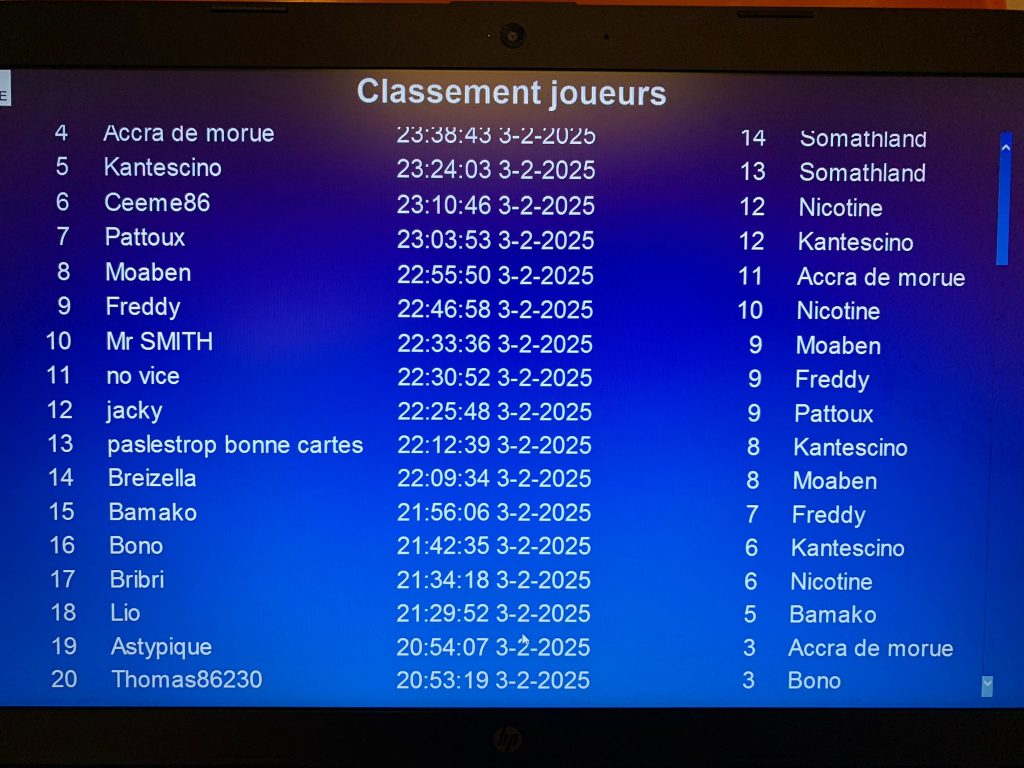 Malgré quelques absents nous étions encore 20 joueurs ce soir, dont un invité et peut-être nouveau joueur : bienvenue à FRANCK alias CPASDROLE, qui si j’ai bien compris est le mari de la coiffeuse de notre Président.