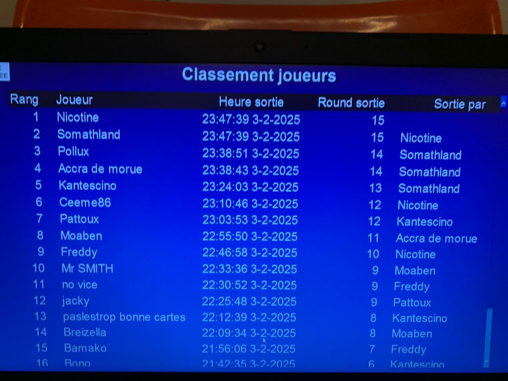 Il faudra investiguer pour savoir ce qui s’est passé en table 2 : j’ai complètement loupé la sortie et le départ précipités de MR SMITH, victime d’une BRIDGET en réussite d’après ce que j’ai compris. 18, 17, nous passâmes dès lors à deux tables après l’éclatement de la table 2. A partir de là, les choses s’équilibrèrent dans un balai harmonieux : en table 1, changement vestimentaire pour ASTYPIQUE qui revêtit son habit de boucher . CPASDROLE, KANTESCINO et JACKY dépecés, découpés et réduits en viande hachée menue. BONO, victime d’une chatting river, investissait quant à lui dans les actions de son bourreau du jour, MISTER SOMATLAND.