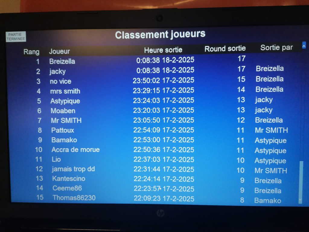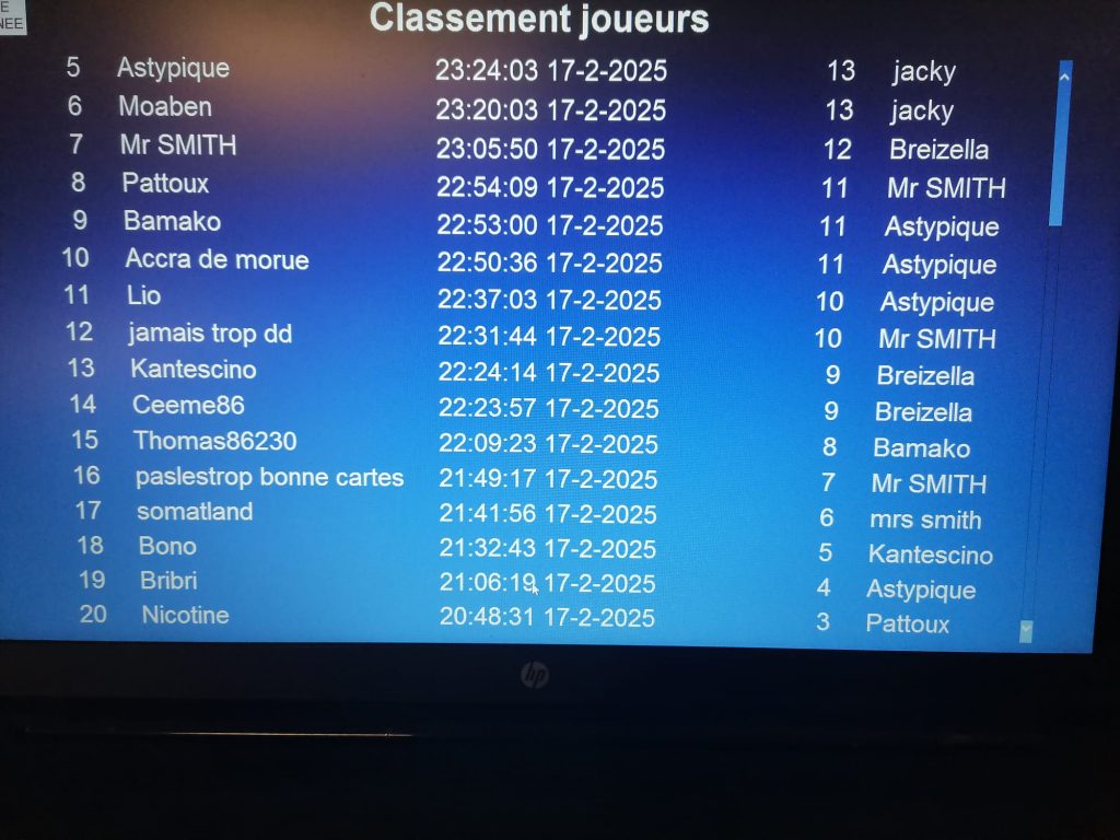 Je soupçonne MOABEN d’avoir des compétences secrètes en matière de hacking ou piratage informatique, comme par hasard il était encore en table 1, et ce depuis plusieurs semaines déjà. Le souci c’est qu’une fois en place, il n’en bouge plus, là encore il avait déjà réservé sa place pour la TF le filou (et en même temps, bon courage pour le déloger!…). Accompagné par DD PALISTRO CEEME BREIZHSTORM et MR SMITH.