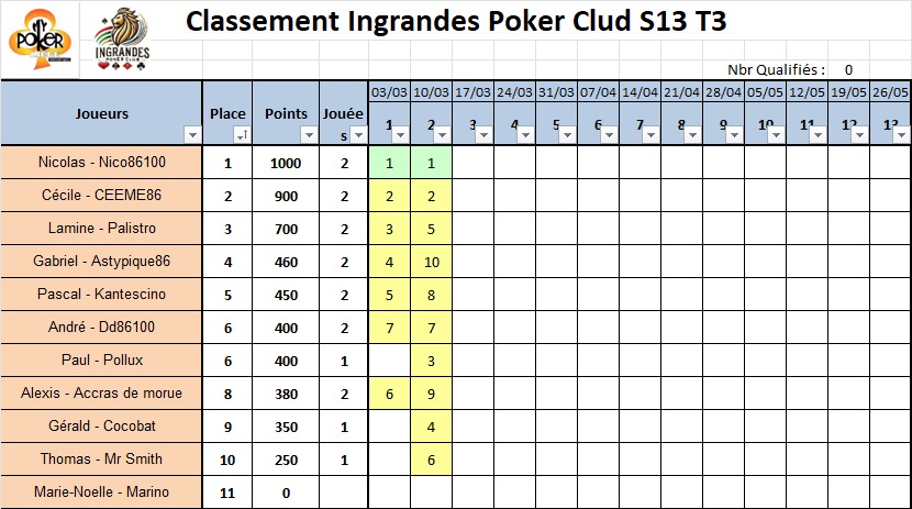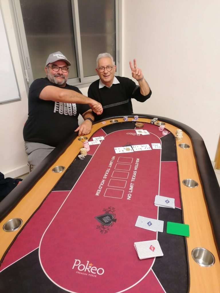MOABEN détroussé, JACKY braqué, LIO dépouillé, KANTESCINO plumé, BONO siphonné malgré son retard tic-tac tactique, et ACCRAS DE MORUE pêché, c’est bien simple on y passa tous tant notre POLLUX était injouable, souvent bien aidé par le board, et quelques fois sauvé, quand par ex une doublette du J lui donna une double paire supérieure à celles que LIO avait déjà. MOABEN réussit cependant à toucher deux fois les AA, et à ramasser deux fois les blinds tellement il est respecté! JACKY était bien parti pour finir en canard laqué, et ne dut son salut qu’un un transfert en table 1, grâce à la place que venait de libérer ASTYPIQUE. Le valeureux capitaine de notre équipe engagée au CFPA avait visiblement donné jusqu’à la dernière goutte de son énergie la veille en manageant ses troupes et en allant lui-même décrocher la victoire, résultat il n’avait plus de jus (et on ne peut pas craquer tous les jours les KK avec K7 off). Bravo à lui et à toute l’équipe pour ces résultats du we, vous avez fait honneur au club et vécu de chouettes moments ensemble.