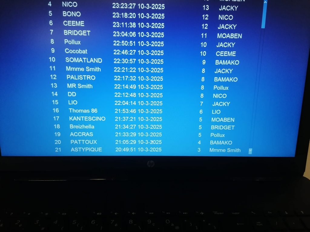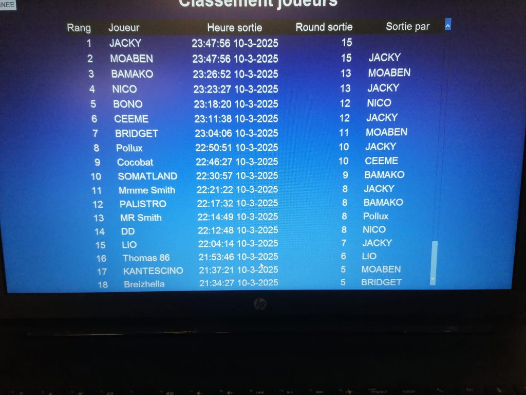 PALISTRO, MME SMITH et SOMATLAND rendirent les armes peu avant les honneurs de la TF aux portes de laquelle échoua également COCOBAT. A force de l’asticoter, CEEME retrouva COCO pour une ultime confrontation et gagna son précieux out. Ce fut LE coup qui changea la dynamique de la partie, et pas seulement parce qu’il déboucha sur la TF. Visiblement atteint, marqué émotionnellement, POLLUX n’avait plus le coeur à continuer la partie sans son COCO chéri, aussi il abandonna ses jetons à JACKY (qui ne savait déjà plus comment ranger les siens) pour aller finir la soirée au TRIPORTEUR avec son Gégé, ou se tripoter directement chez lui en cas de fermeture. Félicitons les autres lauréats de la TF : BAMAKO, BONO (bien accroché à son rocher, insubmersible), BRIDGET, CEEME, JACKY, MOABEN, et NICO.