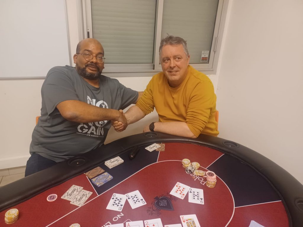 Après la préparation de la salle le vendredi, la particpation à l’Open samedi (dans l’organisation ou comme joueur, parfois les deux), le nettoyage des lieux et le championnat par équipe le dimanche, nous enchaînions un quatrième jour consécutif lié au poker ce lundi. Ca aurait pu en décourager certains, au lieu de cela nous étions encore 20 à vouloir en découdre et tant mieux. Même JACKY pourtant pas au top de sa forme avait tenu à être présent, pourtant il ne se faisait guère d’illusions sur sa performance du soir (et nous non plus pour être honnête. Vous avez dit contrat?)