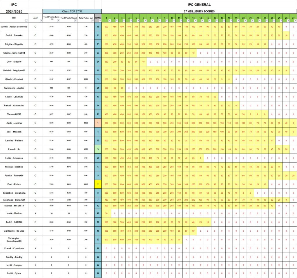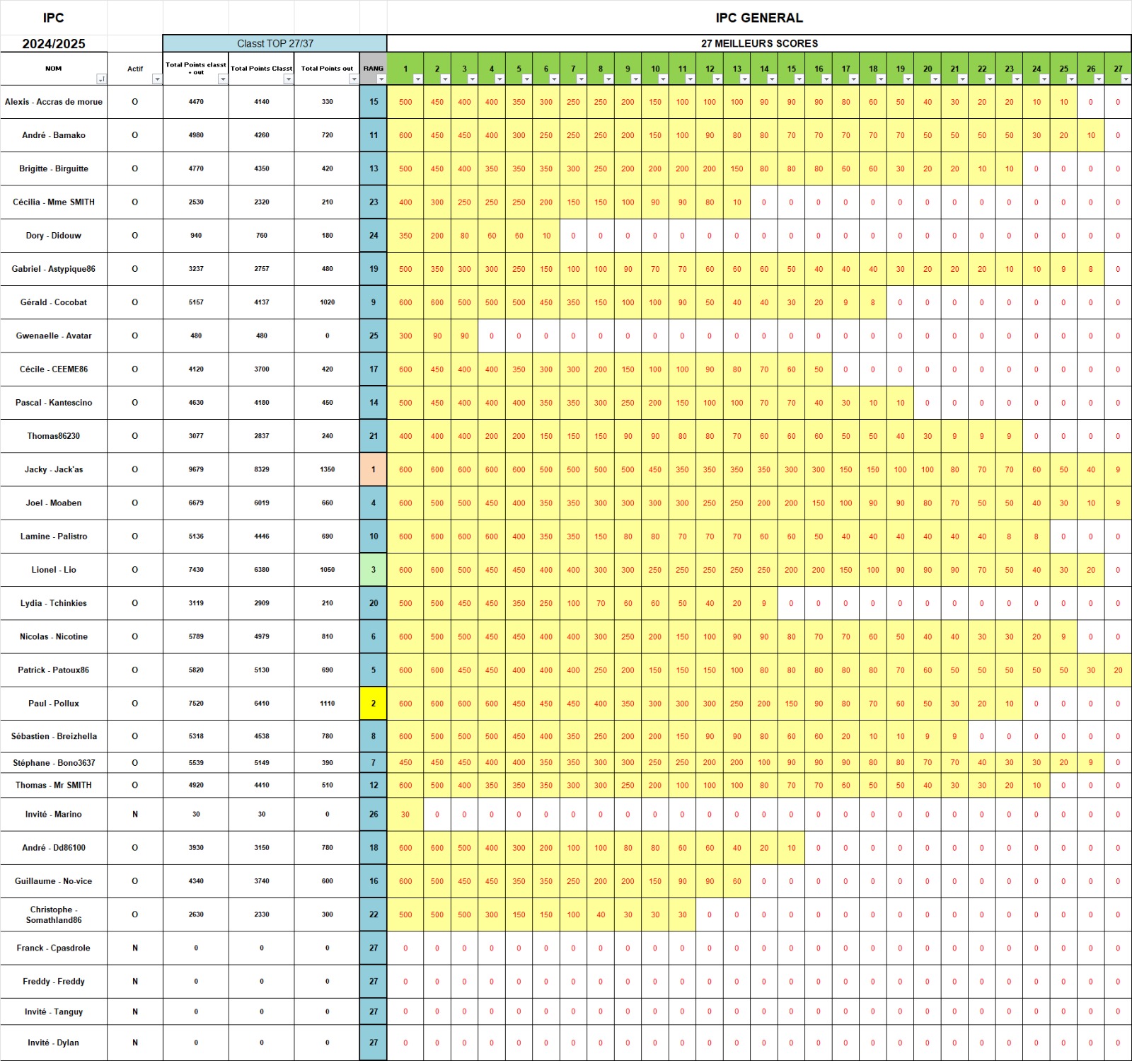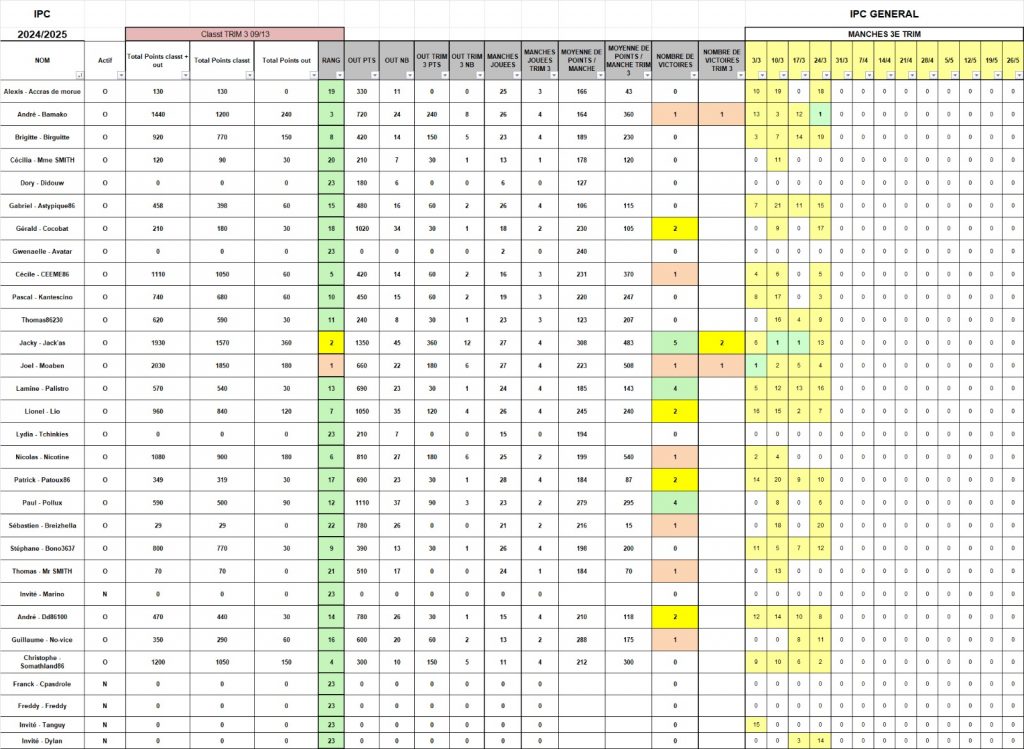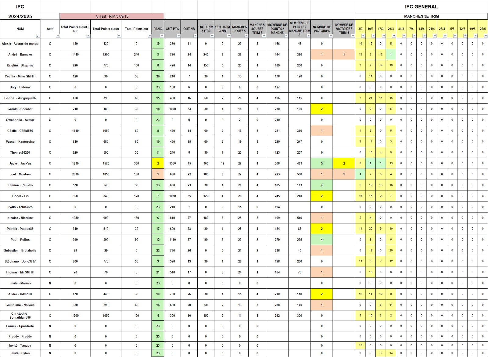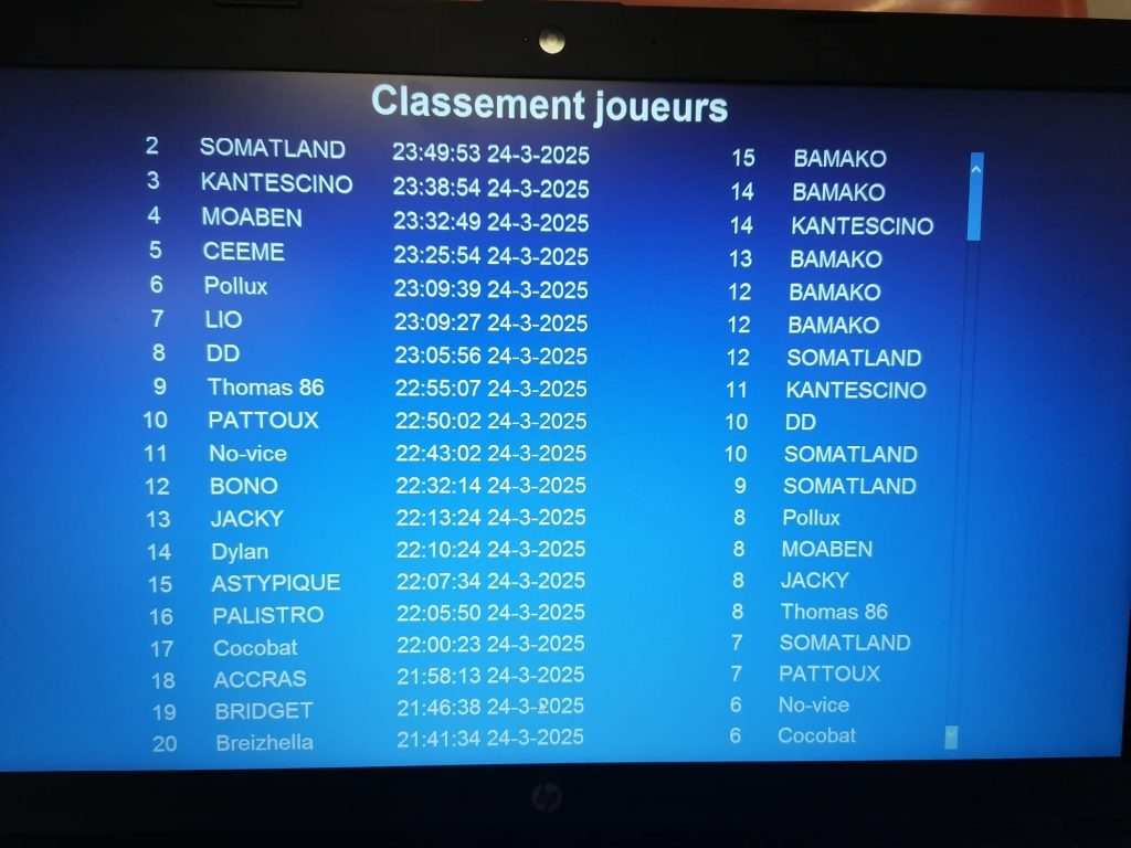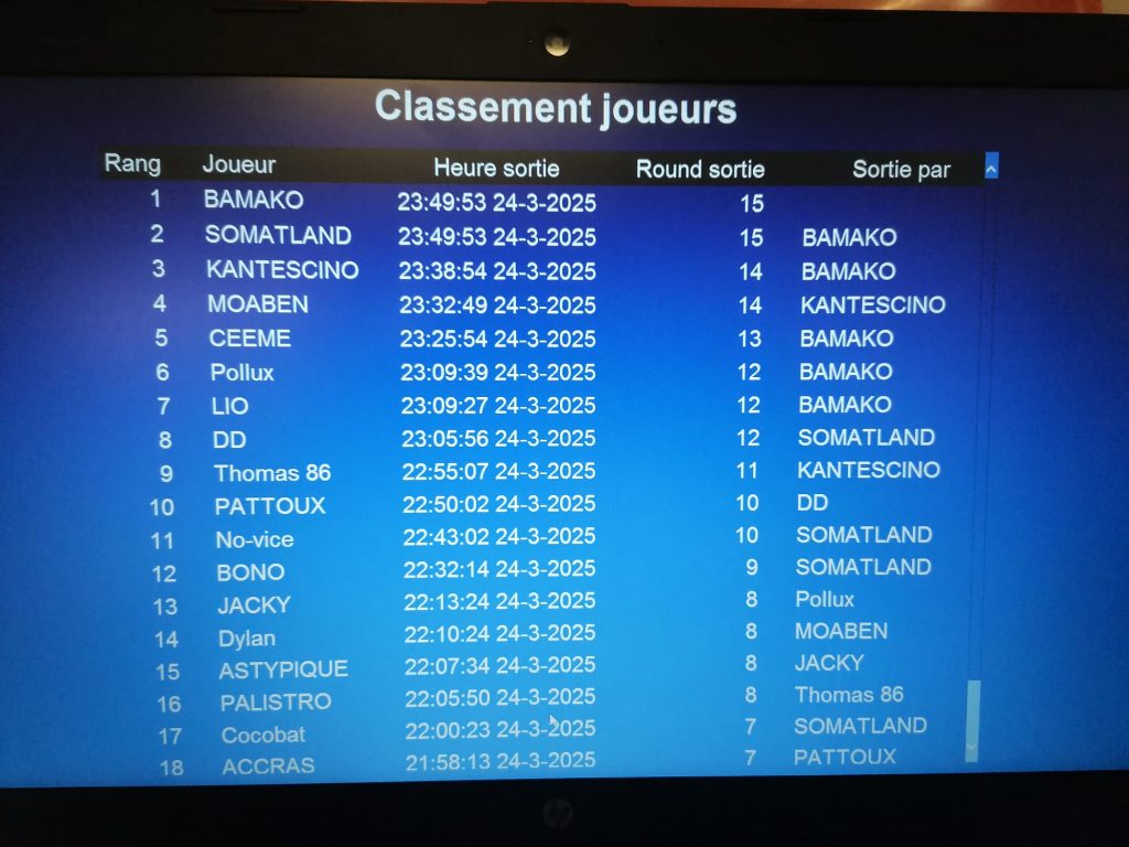 Félicitations à BAMAKO pour cette victoire, bravo à SOMATLAND qui y a sans doute longtemps cru, et à KANTESCINO pour ce podium. MOABEN, 4è ce soir et au Général (on l’a peut-être enterré un peu vite le JOJO, il s’est remis sur les bons rails depuis le début de l’année déjà) prend les commandes du troisième trimestre, devant JACKY et DD.