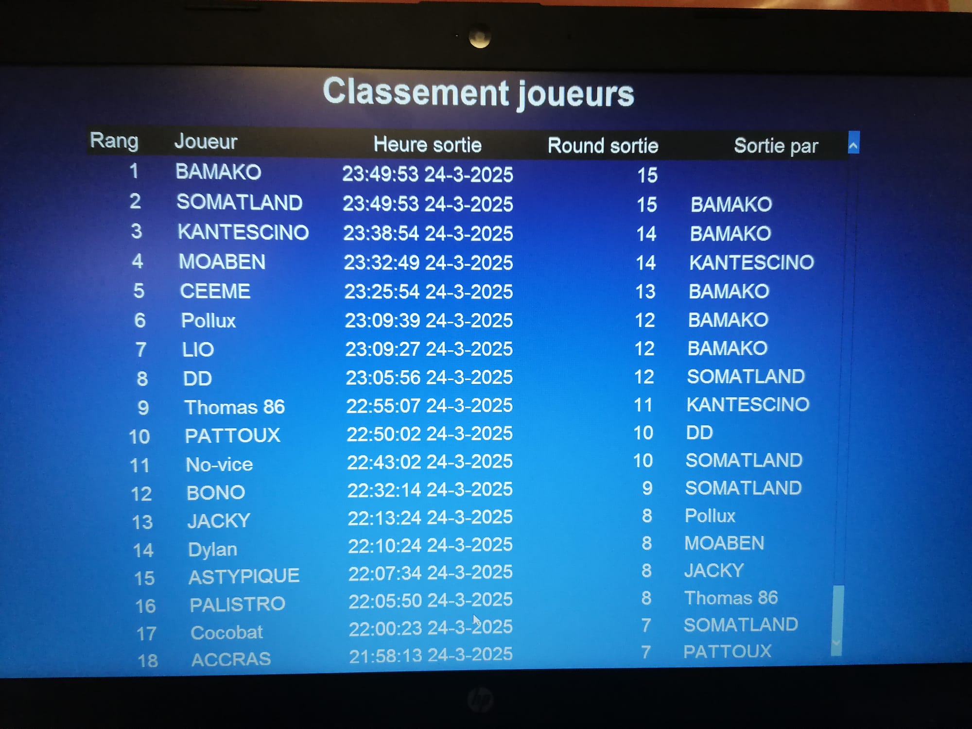 La cour des miracles s’arrêta là pour DD, 8è. LIO tenta sa chance avec K8 coloriés et cinq blinds et entraîna POLLUX dans sa chute, dont le tapis fut payé par BAMAKO, qui fit un strike sur ce coup là, car après comptage et recomptage, POLLUX et BAMAKO avaient exactement le même stack. Madame attendra (l’arrivée de MOABEN, qui n’était pas pressé d’y aller, ou le retour de son Roi), car BAMAKO n »avait plus du touit envie de rentrer, à ce stade et comme d’habitude du reste, il voulait aller au bout. Et c’est ce qu’il fit car hormis SOMATLAND qui libéra DD et KANTESCINO MOABEN, il croqua un a un(e) tous les joueurs de la TF.Et histoire de finir en beauté, avec les 10 vs les 99 chez SOMATLAND, qui sont des monstres en HU.