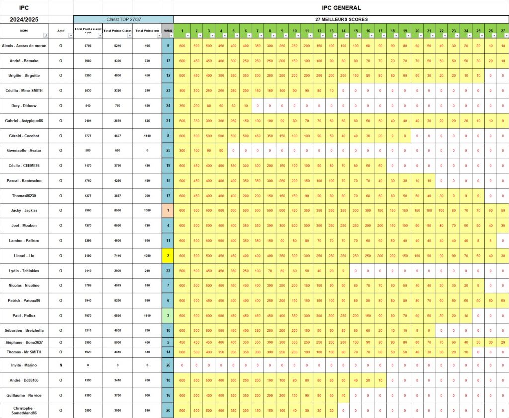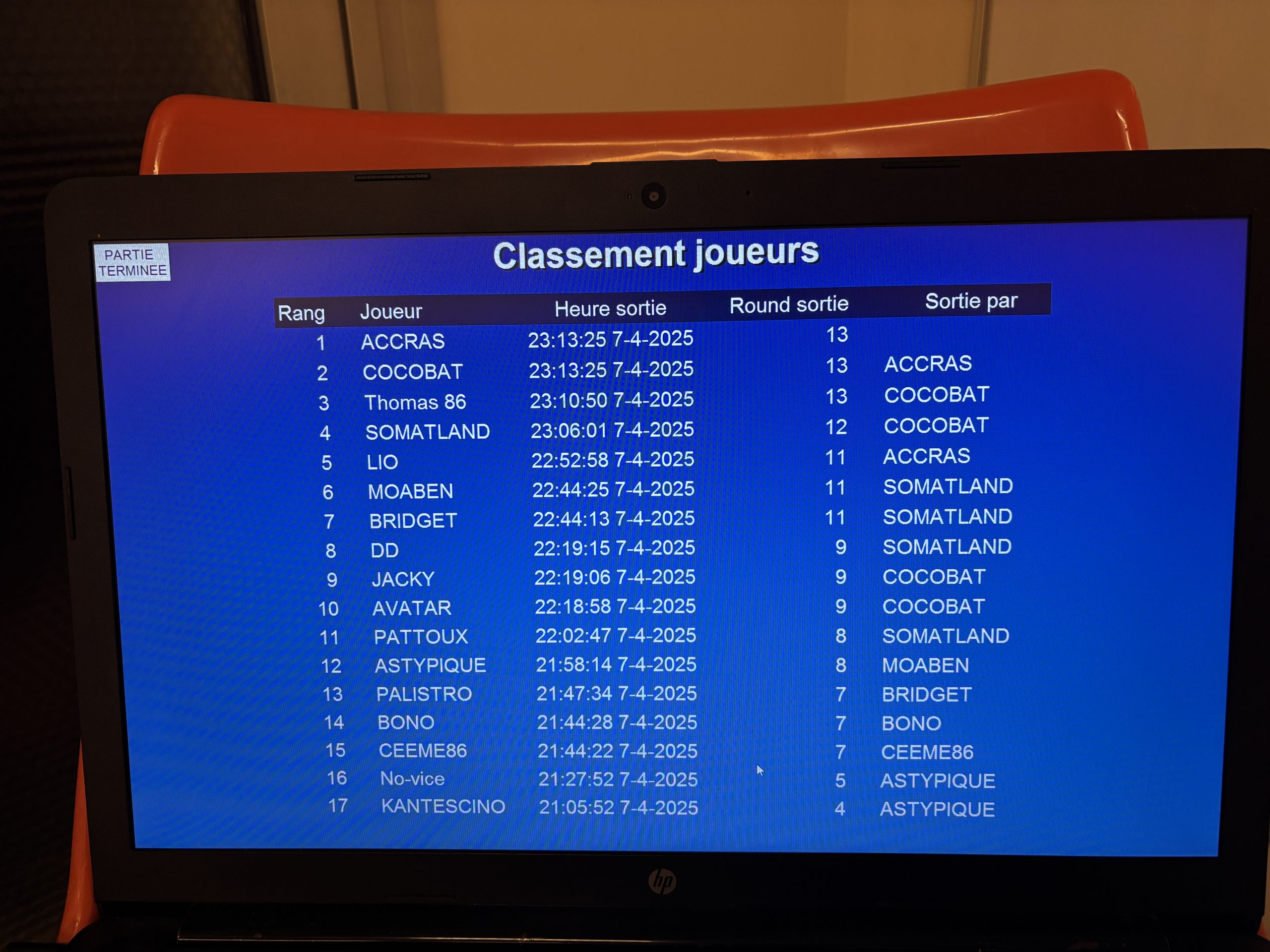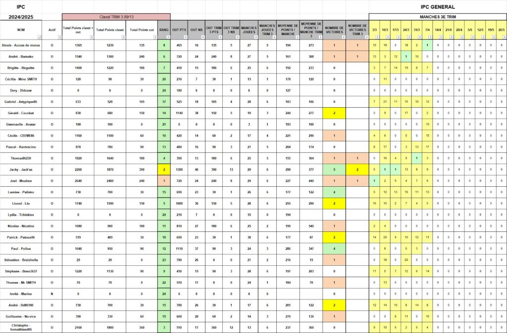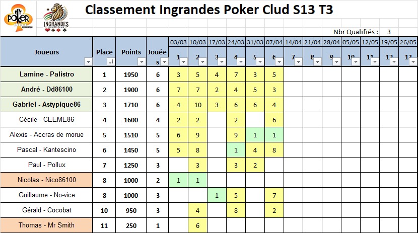 C’est la première victoire pour ACCRAS, saluons-la comme elle le mérite. Il faut souvent un peu de chance au bon moment pour gagner, attention tout de même à ne pas chercher à en abuser ni à tenter le diable si ACCRAS ne veut pas se faire appeler CRA-CRA. Belle deuxième place pour COCO, qui aura joué et été joueur ce soir, malgré une crise d’allergie aigue. Et bravo à THOMAS, qui renaît au printemps comme un pied de vigne après l’hiver. Vigilence, car les gelées matinales et dégelées noctures peuvent endomager les récoltes, en attendant il engrange et pointe à la 4è place du classement trimestriel, dominé par MOABEN, suivi de JACKY et SOMATLAND. A noter enfin les 6 outs de SOMATLAND et les 4 de COCO. Encore 7 journées, il est temps de tout donner (sauf vos jetons).
