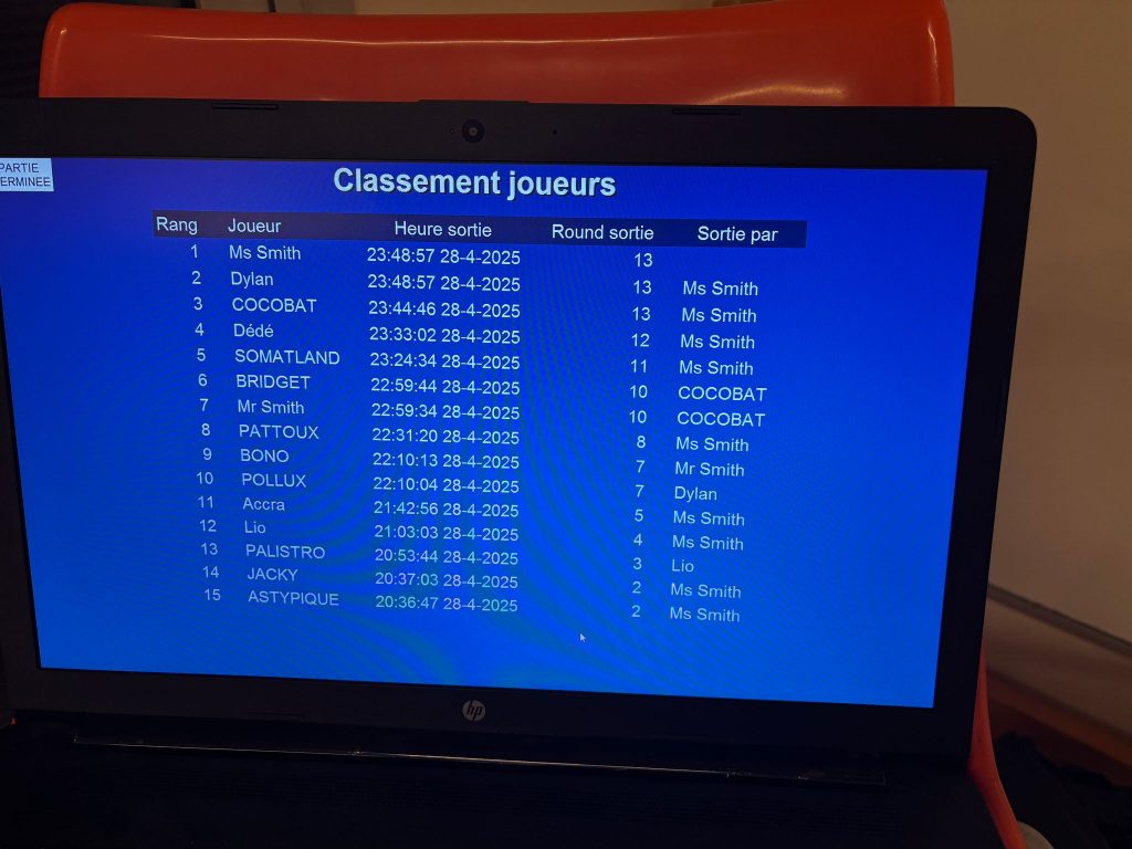 COCO fit le show et anima la TF presqu’aussi bien qu’une soirée karaoké, et fit plusieurs fois l’ascenseur. Il se remit bien d’aplomb après un strike sur MR SMITH et BRIDGET, mais MME SMITH reprit son inexorable marche en avant : PATTOUX, SOMATLAND, puis DD se firent piéger. Attention quand même à bien garder ses cartes même quand on a payé le tapis du joueur, sinon on risque le muck. Le coup pouvait porter à contestation mais les cartes étaient identifiables, et nous avons privilégié l’esprit du jeu au réglement strict. Merci à DD pour son fair-play car il venait quand même de se faire défoncer une double paire flopée (bien que le coup se soit décidé pré-flop) par une quinte river, ce qui doit faire encore plus mal au c… dans ces circonstances…
