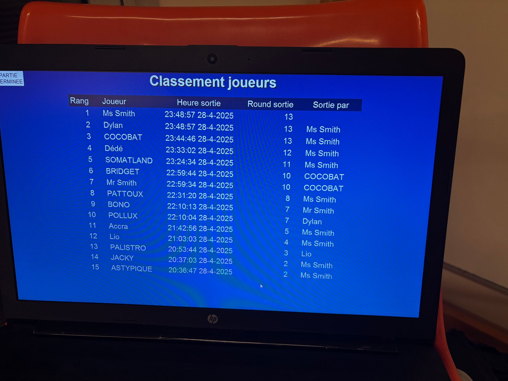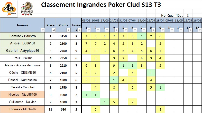 Mais même lui ne put rien faire pour empêcher MME SMITH (qui aura touché quatre fois les AS dans la soirée, plus quelques boards bien sympatiques) d’empocher sa première victoire, assortie de 9 outs sur 14 excusez du peu. Beaucoup de coups gagnants, très peu de fautes directes, la recette pour gagner, que ce soit au tennis ou au poker. Félicitations à elle pour cette victoire indiscutable, tant elle a été la patronne du jeu tout au long de la partie.
