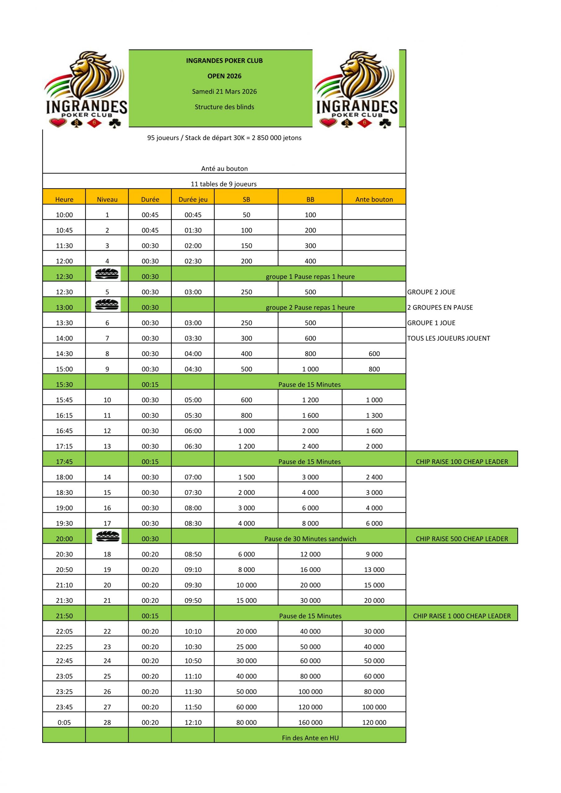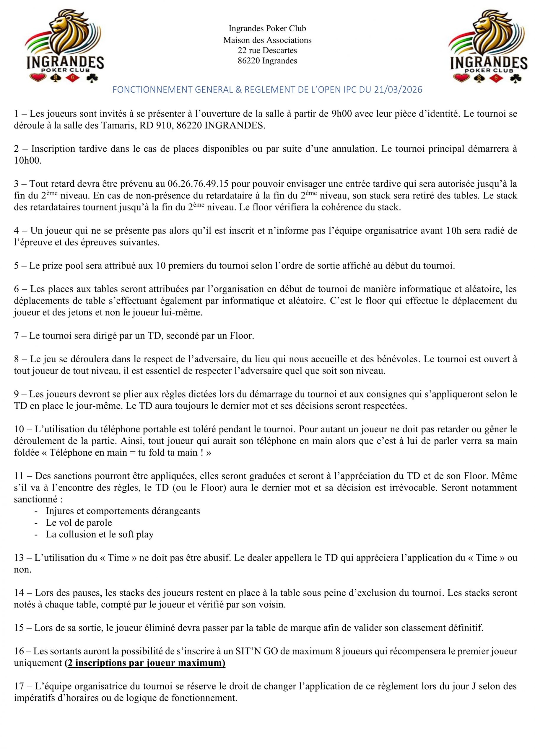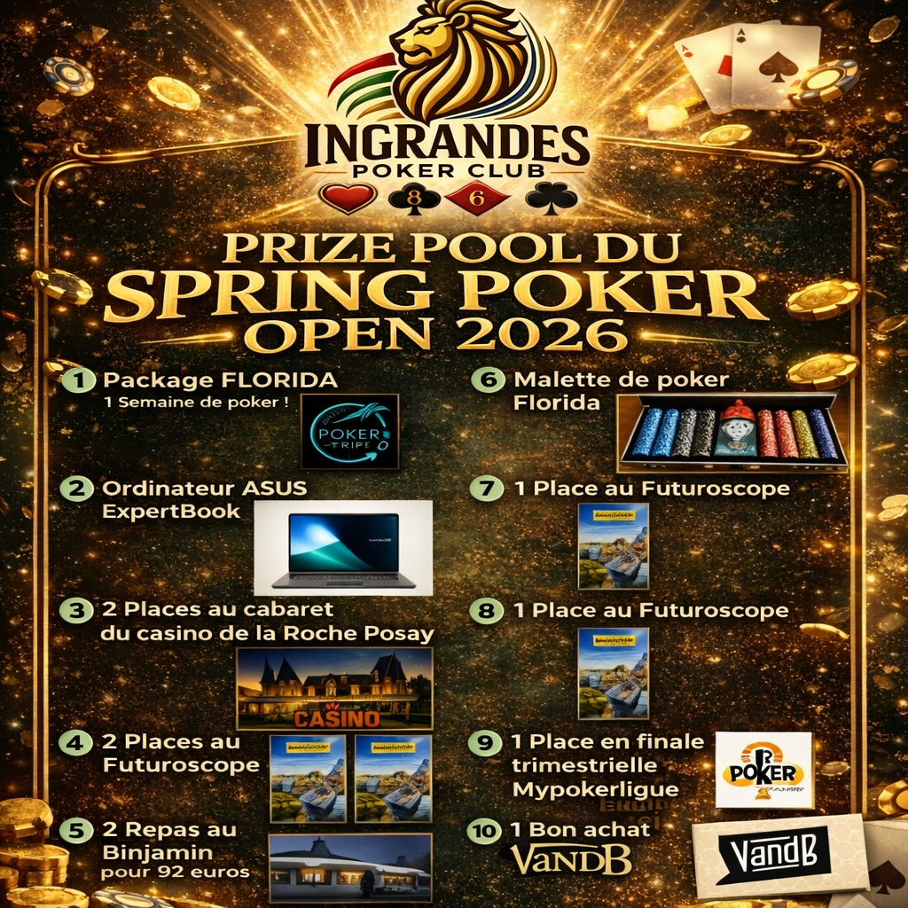 En vous inscrivant à ce tournoi, vous serez automatiquement ajouté à la newsletter du club. Vous recevrez ainsi toutes les mises à jour concernant l’événement : liste des inscrits, prize pool, structure du tournoi, récompenses et bien plus encore